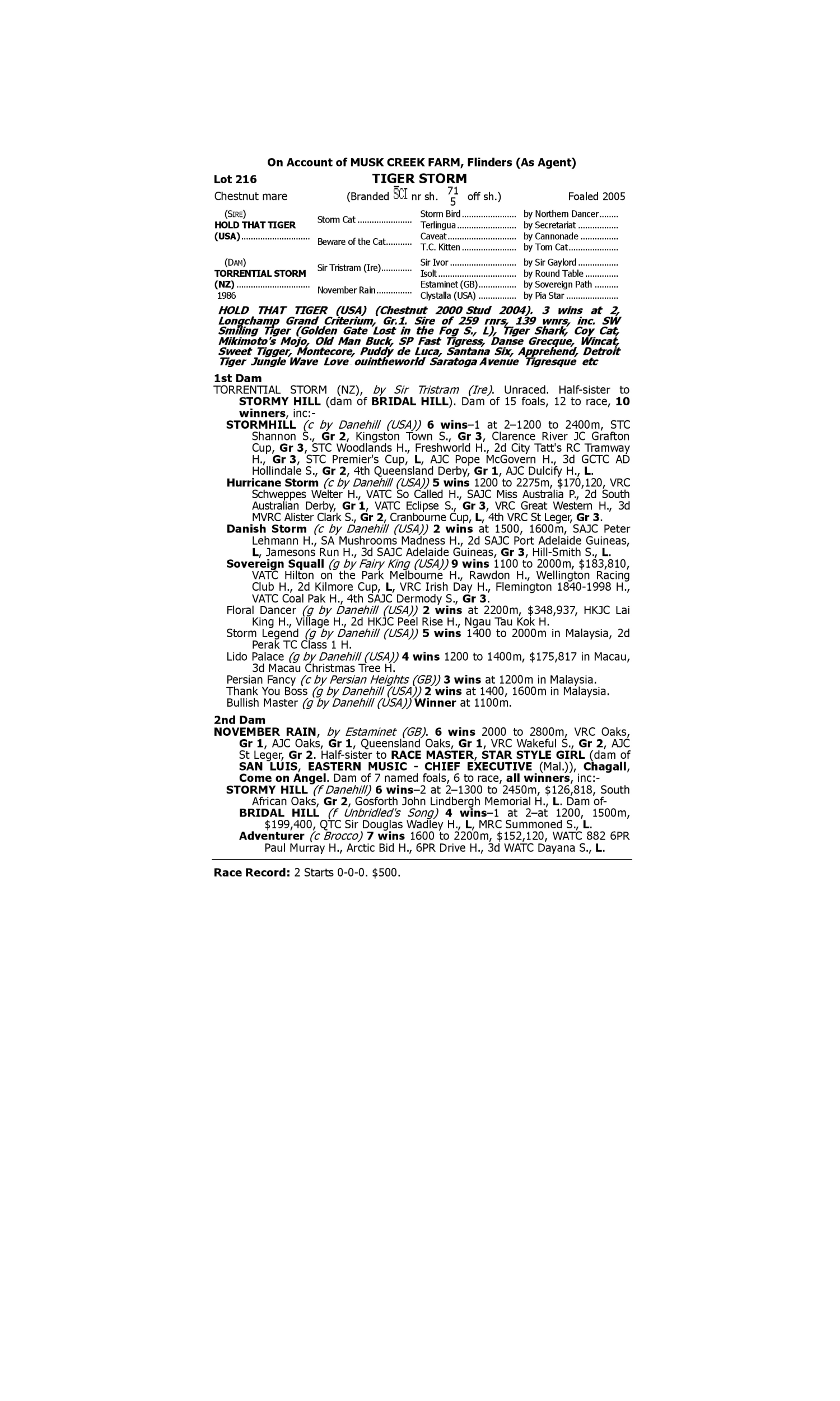 Denison Star (2003.f. by Hemingway-Raunchy Ruler, by Rancho Ruler-Lady Lindlum). 2nd Warrnambool RC Action Fitness H. The Other Man (2005.g. by Delago Brom-Raunchy Ruler, by Rancho Ruler-Lady Lindlum). 1st Warrnambool RC Richardson and Dennis Insurance Maiden H. 2nd Wimmera RC Tooheys Extra Dry Maiden P.