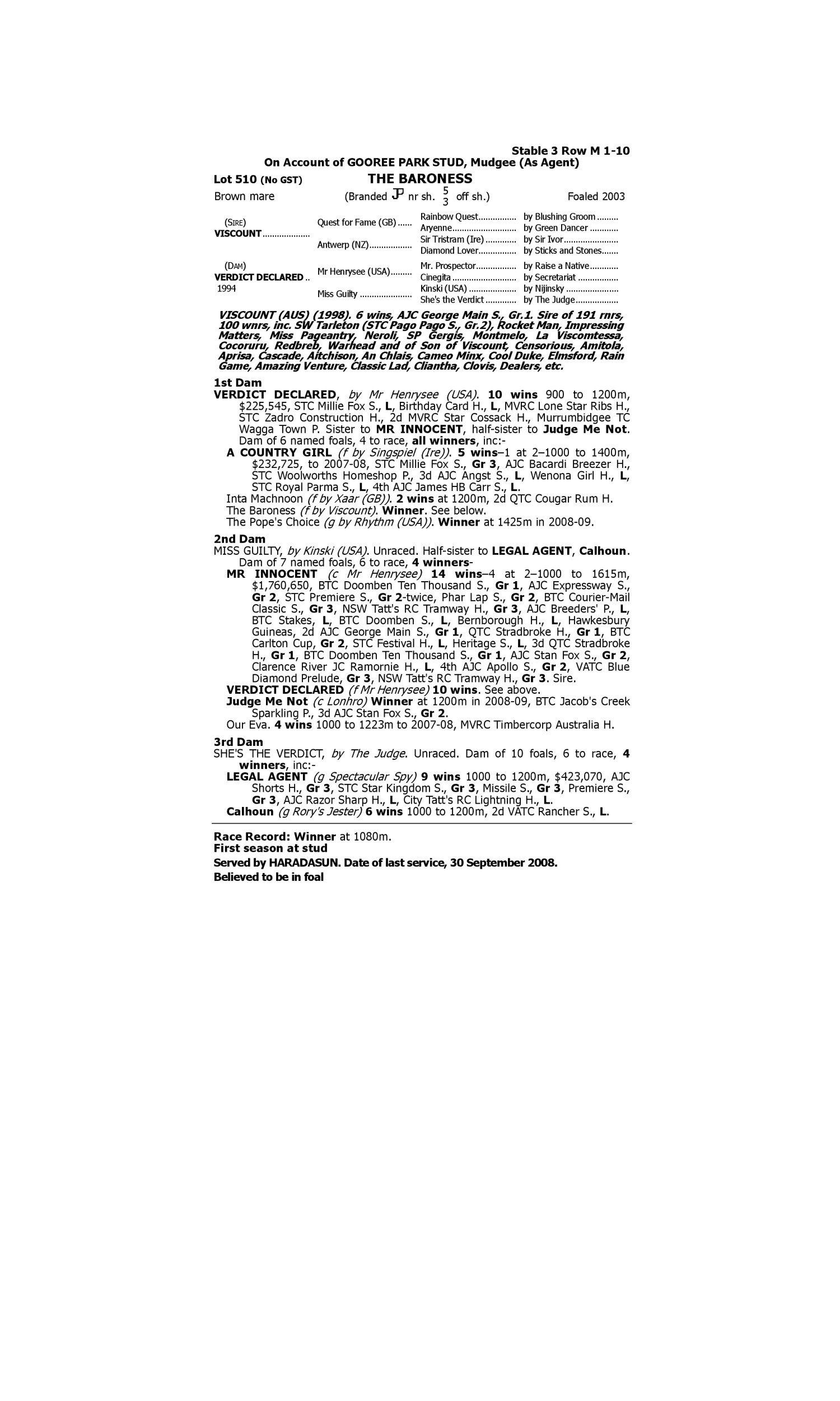 Sweepstaking (2006.f. by Not a Single Doubt-Tennessee Sunrise, by End Sweep-Academic). 1st Qld Tatt's RC John d'Arcy Memorial 2YO H. MY EMOTION (2006.f. by Savabeel-Midnight Rock, by Rory's Jester-Tennessee Midnight). 1st VRC Thoroughbred Breeders S. Gr.3 PERGRAM (2006.f. by General Nediym-Tennessee Royal, by Royal Academy-La Nebbia). 4th SAJC Pewsey Vale S. L