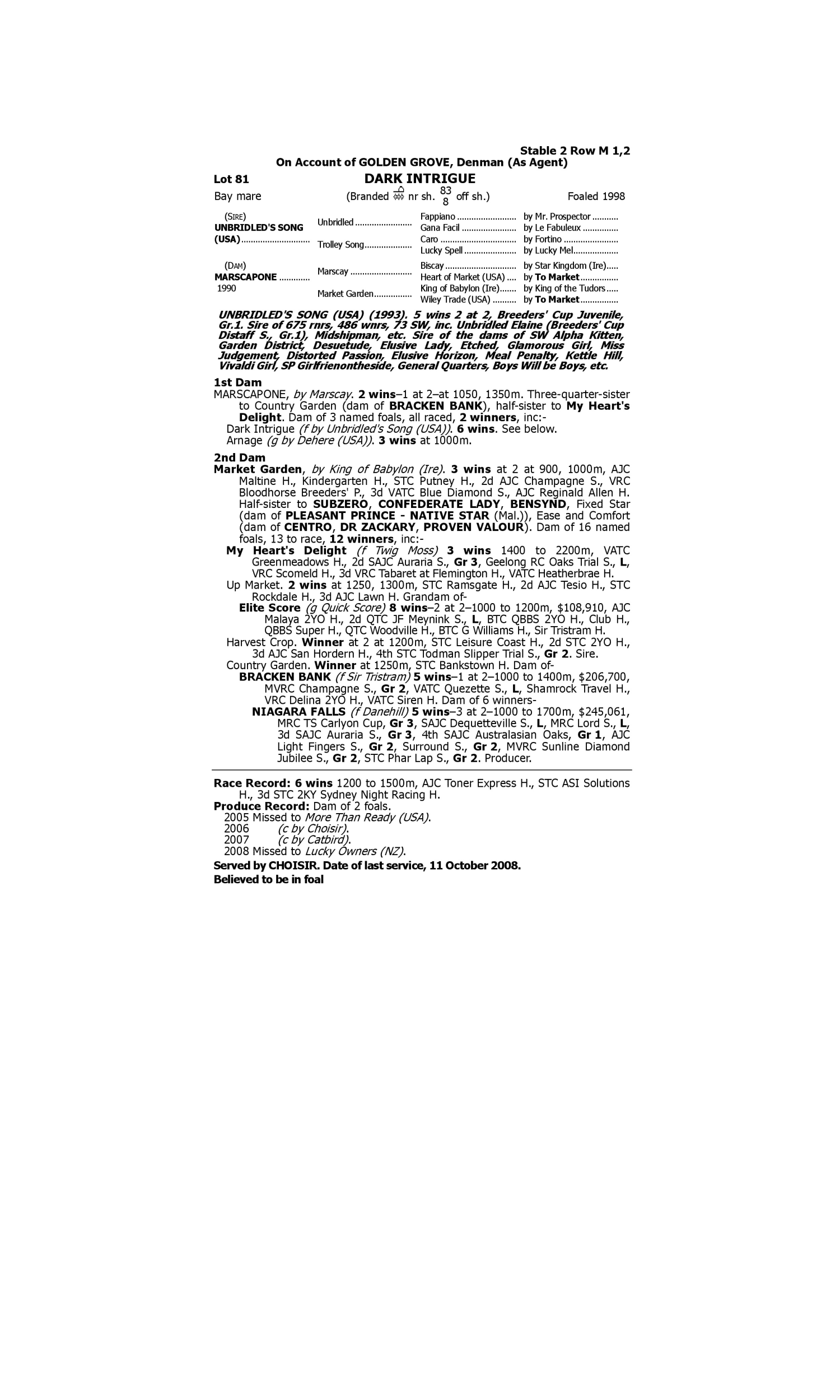 Movie World (2004.f. by Arazi-Dark Hope, by At Talaq-Dark Moments). 1st Mt Barker TC Joan Buchanan Memorial H. Big Moment (2004.g. by Jeune-Autumn Moments, by At Talaq-Autumn Leaves). 1st Singapore TC Class 4 H.