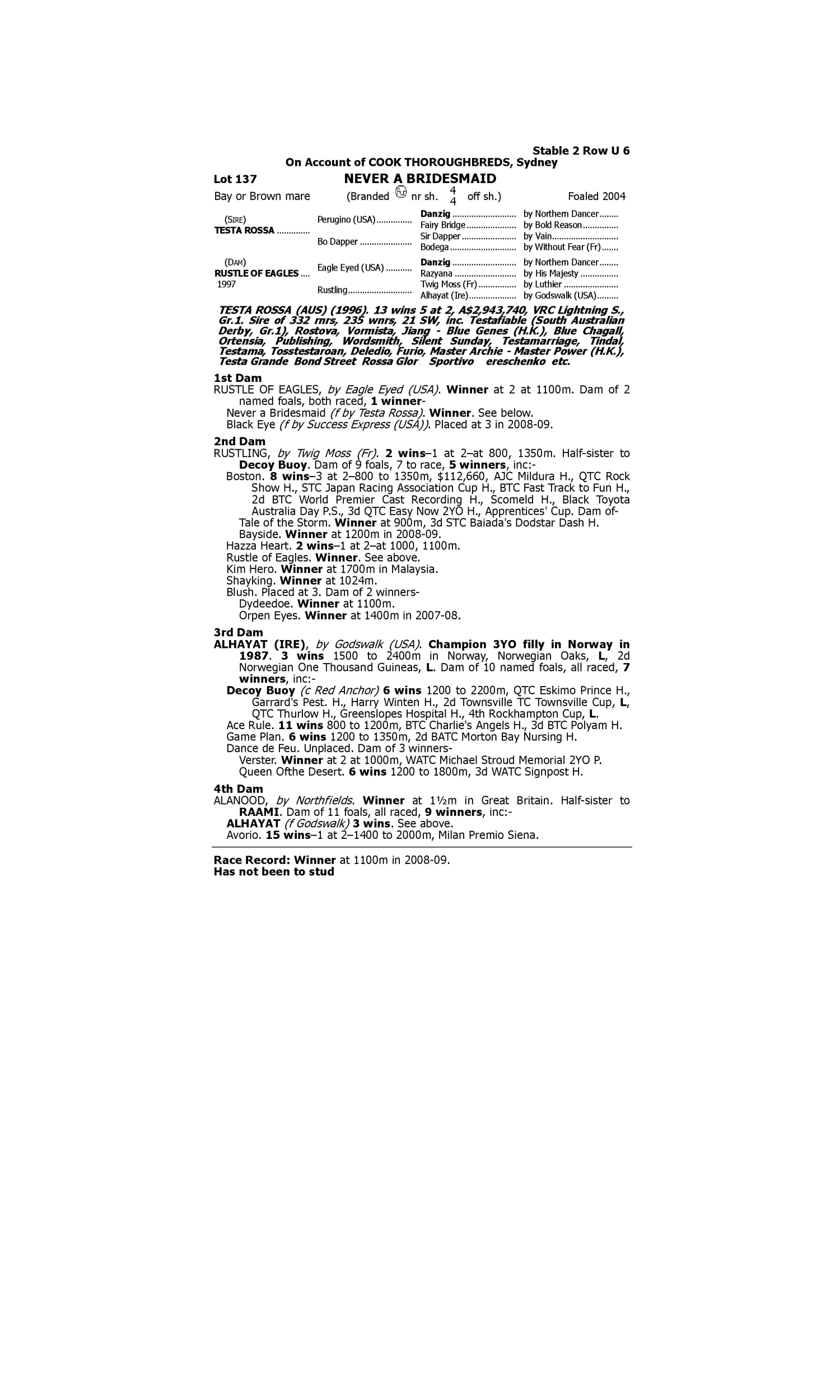 Fasold (2001.c. by Pursuit of Love-Fortify, by Machiavellian-Talon d'Aiguille). 1st Leipzig Preis der Albers Wettbörse Leipzig Ausgleich III ( Portus Blendium (2006.c. by Highest Honor-Kalpita, by Spinning World-Kamaina). 3rd Saint-Cloud Prix Matchem L Splashdown (2006.f. by Falbrav-Space Time, by Bering-Space Ritual). 4th Goodwood Height of Fashion S. L