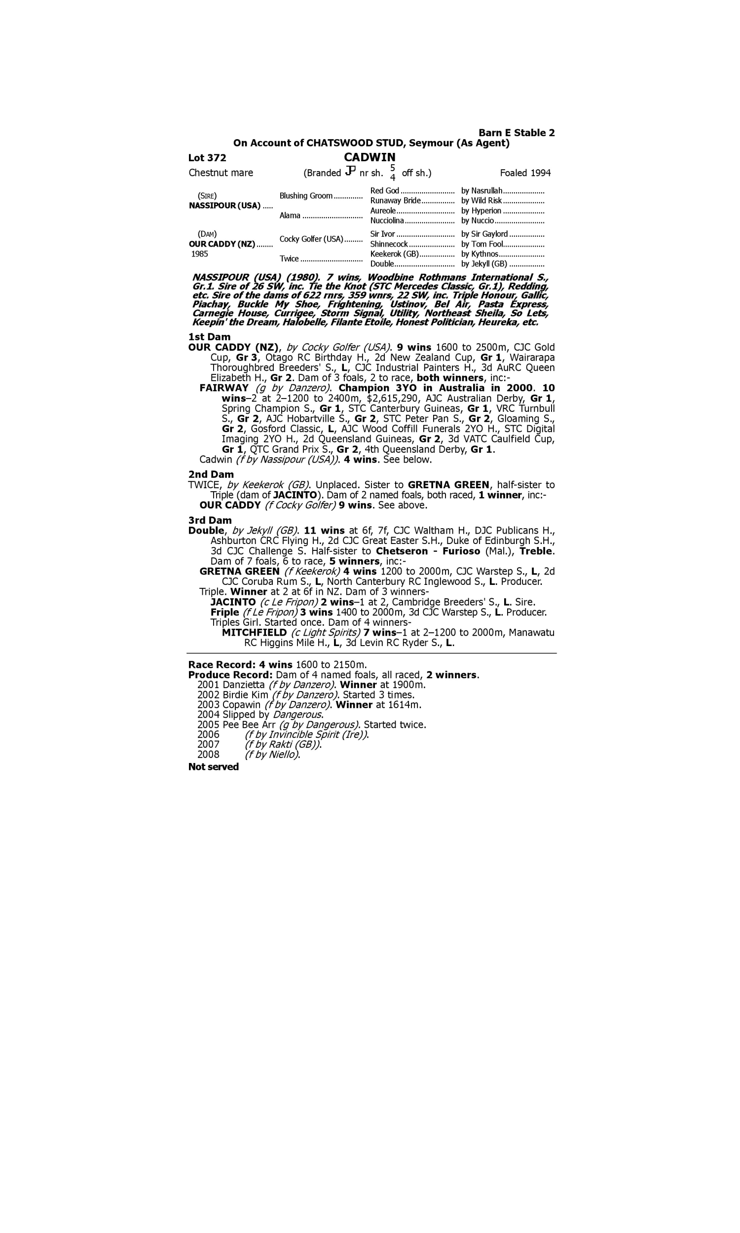 Desert Patrol (2004.g. by Desert Sun-Clarice, by Star Way-Minnie Sue). 1st Rockhampton JC Castlemaine Perkins Maiden H. 1st Yeppoon TC H. Rendzina (2003.f. by Testa Rossa-Capto, by Octagonal-Khaptivaan). 1st STC (Canterbury) Rosehill Gardens Event Centre H.