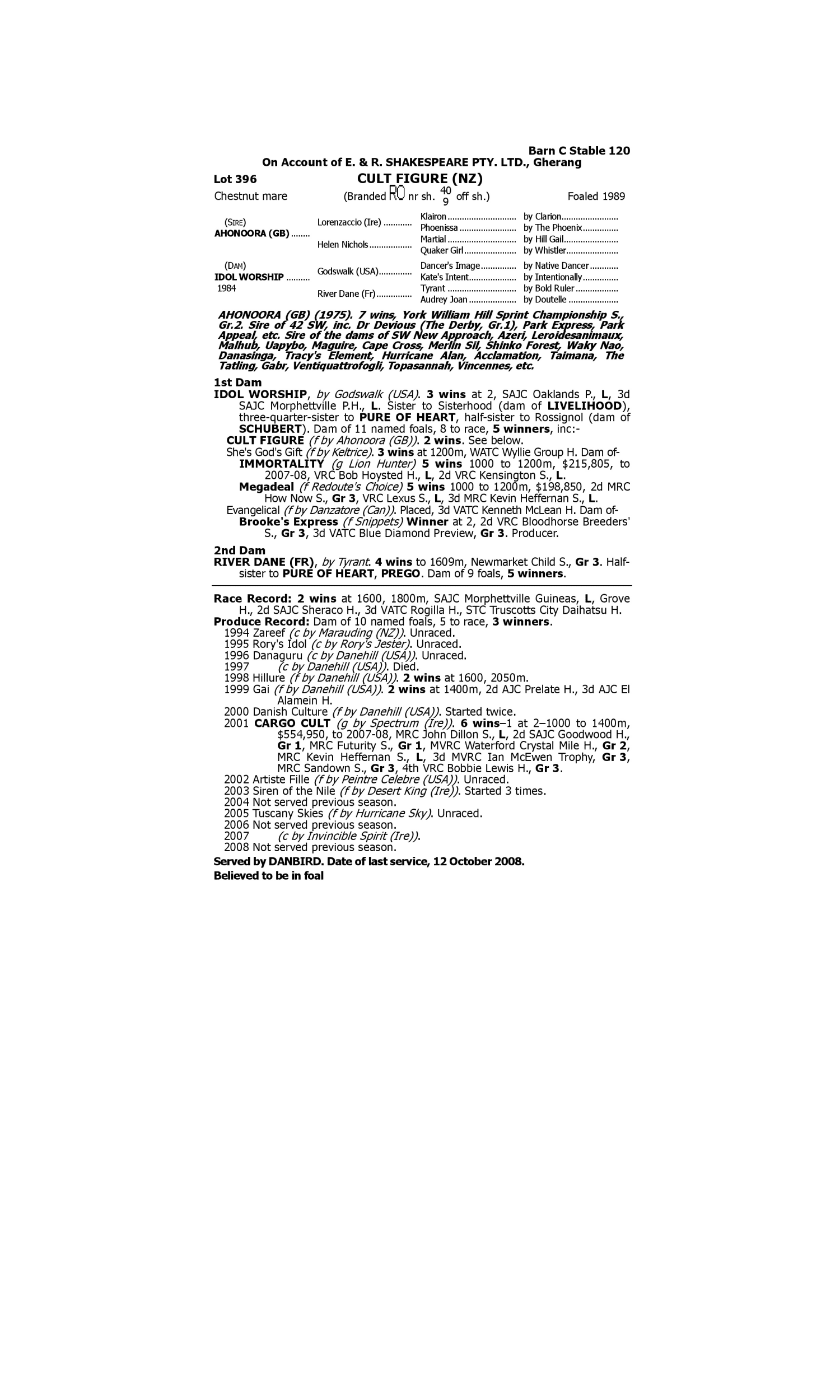Angina (2001.g. by Naturalism-Hot Saucy Duck, by Personal Hope-Cuff). 1st Port Macquarie RC Racing Nsw Appr. School H. 1st Kempsey RC Kempsey Macleay Rsl H. Pit Lane (2004.g. by Van Nistelrooy-Disco Girl, by Marauding-Live it Up). 1st QTC (Eagle Farm) Sirocco Telecom H. Returntosender (2005.f. by Elusive City-Disco Girl, by Marauding-Live it Up). 3rd QTC (Eagle Farm) Princess S. L
