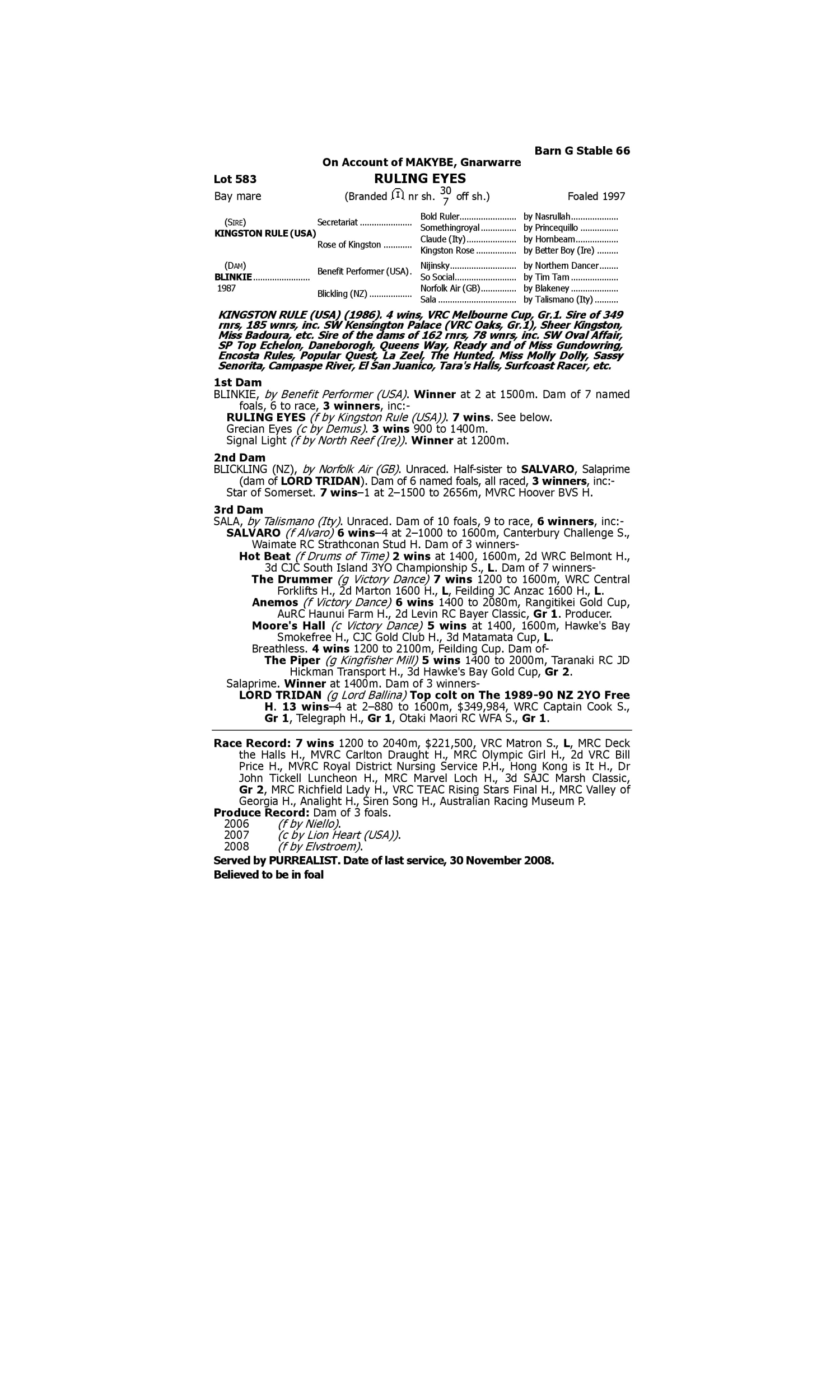 Derivative Receipt (2002.g. by Naturalism-Silent Water, by Pre Emptive Strike-Ponsalu). 1st Tamworth JC Coca Cola Amatil M'Nington H. Capone (2006.g. by Dash for Cash-Early Bloom, by Tolomeo-Just Blooming). 1st TRC (Hobart) Old Virgilians H. 1st TRC (Hobart) Betfair.com 2YO Classic Kenny Starfighter (2002.g. by Turbulent Dancer-Hilary Princess, by St Hilarion-Like a Princess). 1st North Canterbury RC Painted Black @ Greenacres H. Major Canny (2004.g. by Canny Lad-Molly Singer, by El Moxie-Musical Lover). 1st Kalgoorlie Boulder RC R.S. L/Legacy Sprint H.