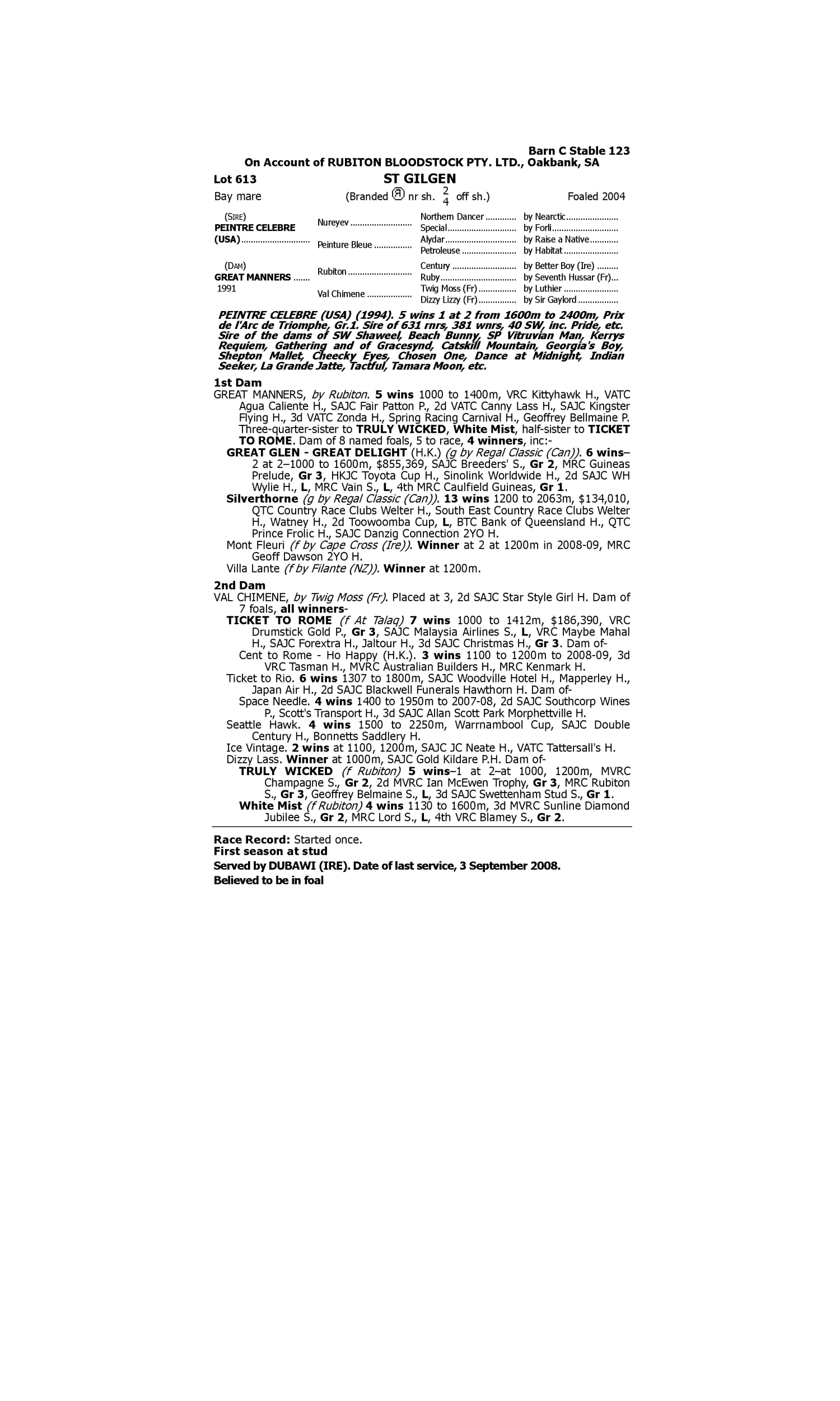 Passed in Twice (2004.f. by Dash for Cash-Lady Ambassador, by Twig Moss-Ambassador Club). 1st Seymour RC Tim Grace H. 2nd Seymour RC Chatswood Stud H. 2nd Bendigo JC Adroit Insurance Group H. Royal Dalton (2006.g. by Danbird-Siobhan, by Western Symphony-La Zip). 3rd VRC (Flemington) Anzac Day S. L 4th VRC (Flemington) Gibson Carmichael S. L