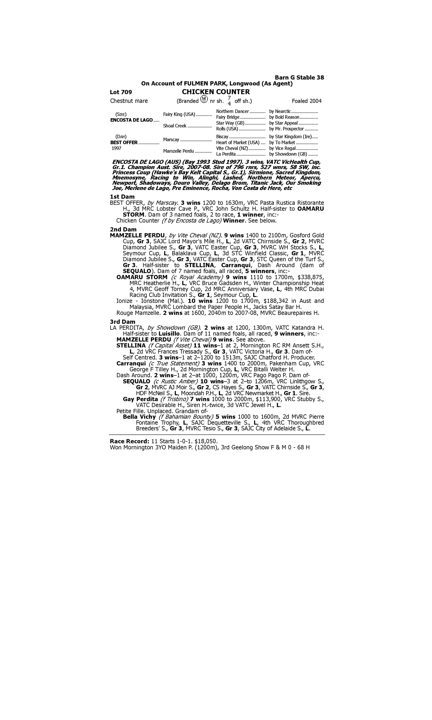 My Sweet Cookie (2004.g. by Hussonet-Miss Heath, by Octagonal-Clifton Gardens). 2nd Scone RC Scone Cup L Kiloton (2003.c. by Spinning World-Mystifying, by Last Tycoon-Jewel in the Crown). 1st STC (Rosehill) Marshalls Motors H. Prix du Sang (2005.f. by Red Ransom-Morinda, by Desert King-Crowning Jewel). 1st GCTC Southern Cross Ten H.
