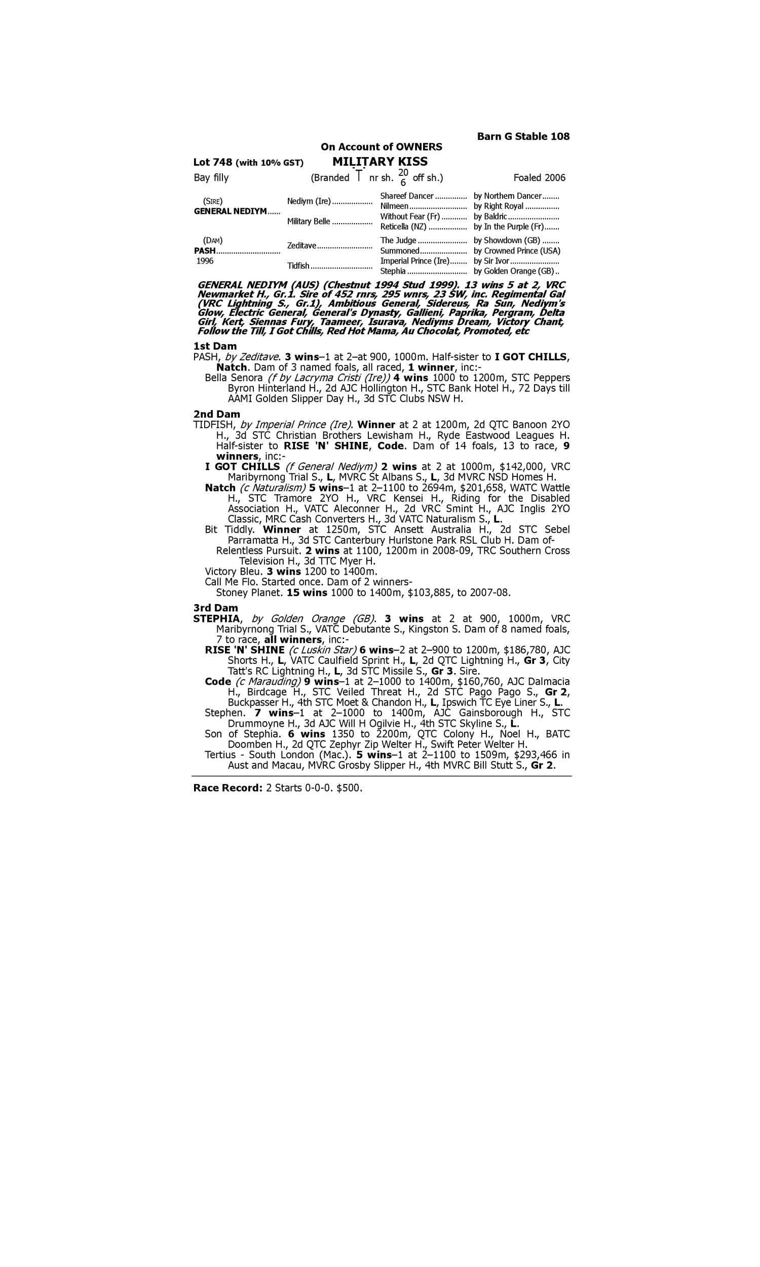 Canturi Lane (2002.f. by Danehill Dancer-Regal Prospect, by Exploding Prospect-Regal Realm). 2nd Narromine TC USMC Gallipoli H. 3rd Goulburn DRC Sunsolutions H. 3rd Golden West RC King's Hotel H. Determination (2003.g. by Show a Heart-Kapin Hand, by Kaapstad-Regal Realm). 1st MRC (Sandown) Des Gleeson H.