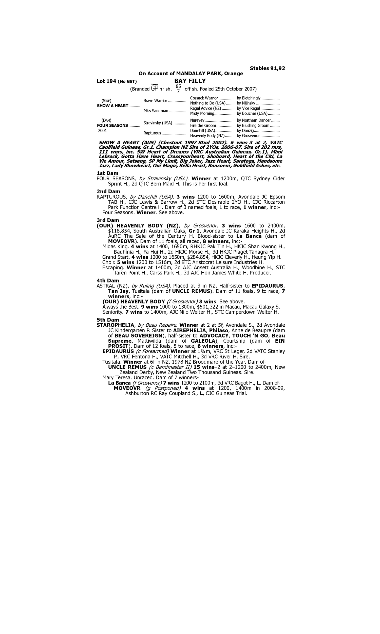 Air Raid (2003.g. by Catbird-Flying Visit, by Fly So Free-Red Luce). 1st Murrumbidgee TC H. 3rd Albury RC H. Cut and Run (2005.f. by Dash for Cash-Flying Visit, by Fly So Free-Red Luce). 3rd Warrnambool RC Fishtales Cafe Maiden P. LAA RAYB (2004.g. by Storm Cat-Society Lady, by Mr. Prospector-La Voyageuse). 3rd Ascot Paradise S. L Just a Coincidence (2006.c. by Forestry-Scads, by Forty Niner-Slew and Easy). 3rd Aqueduct Wood Memorial S. Gr.1 4th Aqueduct Withers S. Gr.3 Ciel Rouge (2006.f. by Red Ransom-Raisonnable, by Common Grounds-Salvora). 3rd Toulouse Prix Aymeri de Mauleon L TRUST OR BUST (2005.c. by Trust n Luck-Dance Lead, by Nureyev-Leading the Way). 1st Mountaineer Panhandle H. L 1st Charles Town Webb Snyder S. L 1st Charles Town Allowance