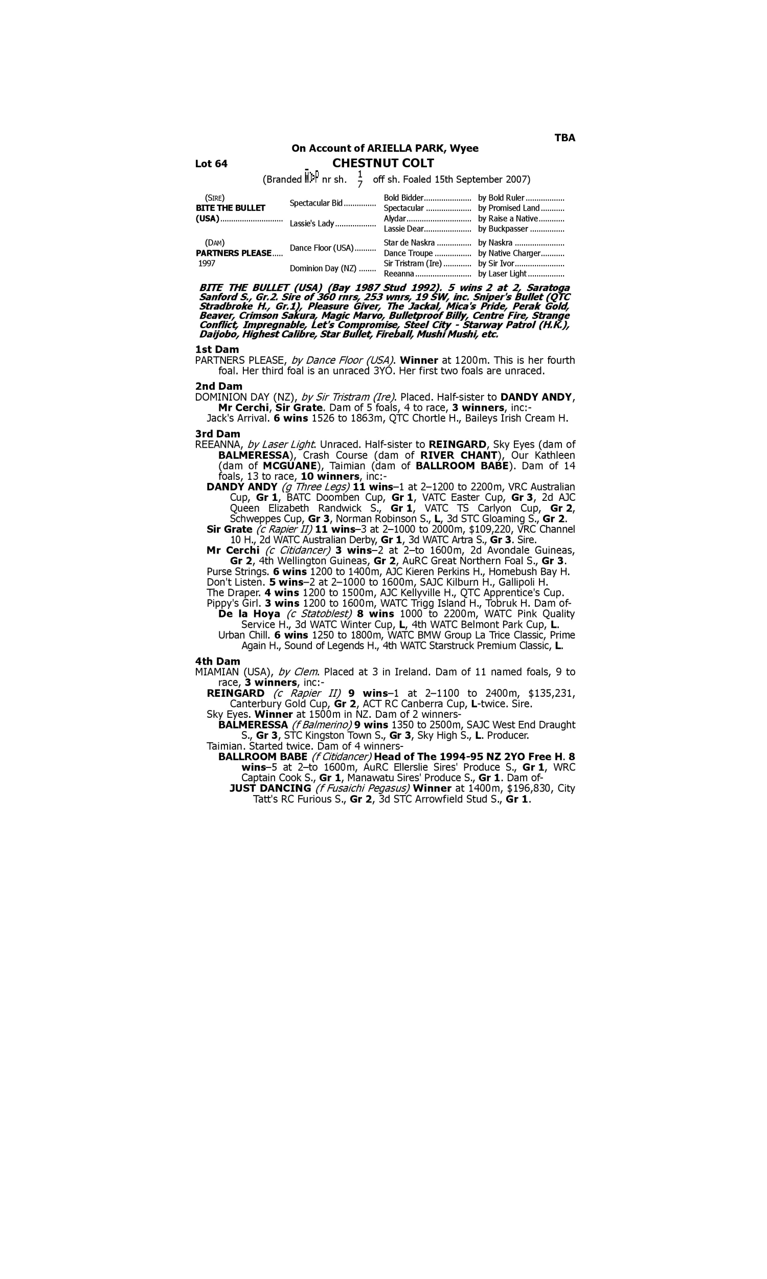 Fabulash (2004.f. by Tobougg-Parisina, by Last Tycoon-Satska). 1st Wine Country RC Maiden P. Belleza Veloz (2004.f. by Hemingway-Brocco Dancer, by Brocco-Satska). 1st MVRC (Moonee Valley) Ready Workforce Flying H. 2nd SAJC (Morpethville) Proud Miss S. L