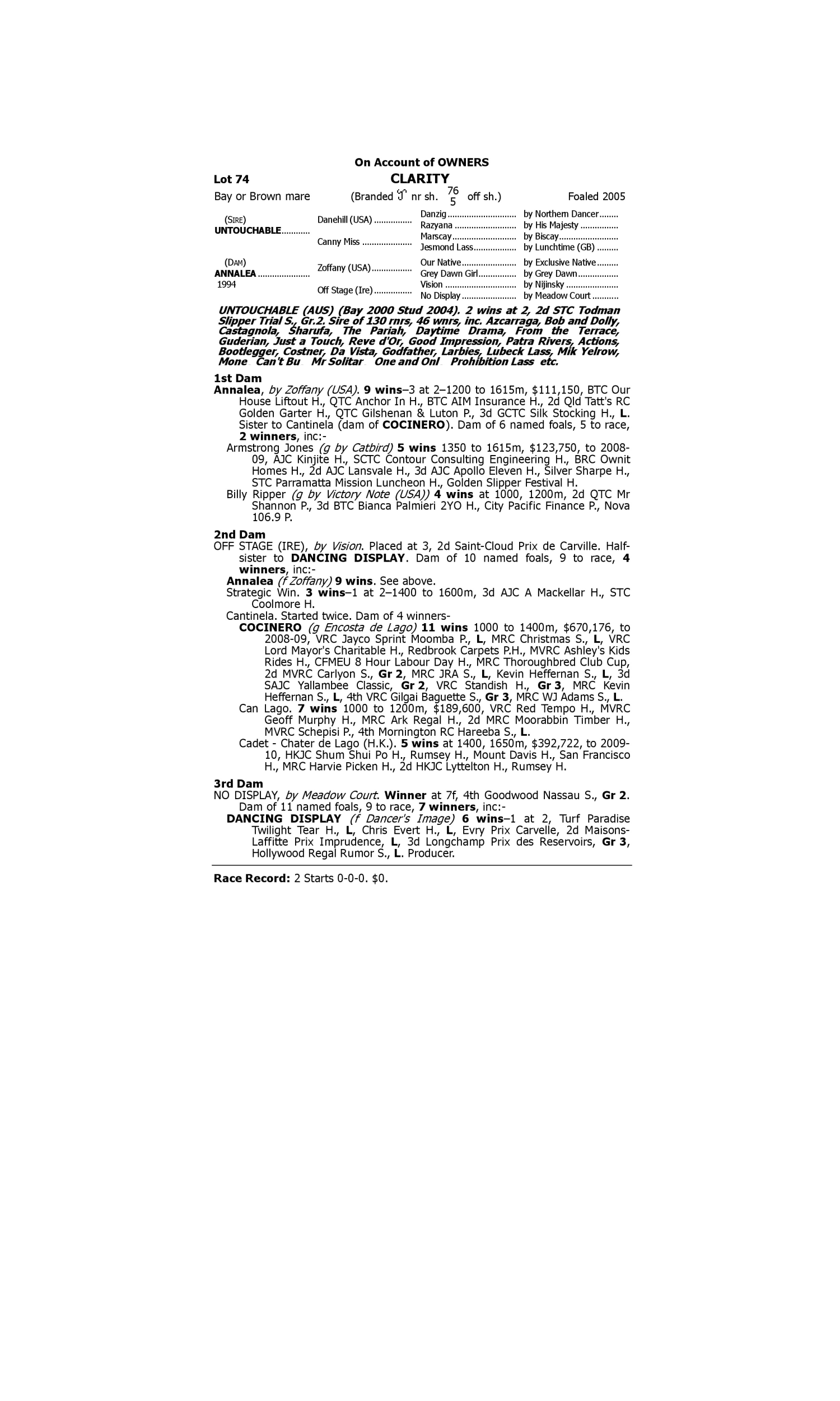 Fille Majestique (2004.f. by King's Best-Kapalua Bay, by Grosvenor-Dowager Empress). 1st Goulburn DRC Goulburn Cup in November H. 1st Goulburn DRC Young's Stockfeeds H. 2nd Illawarra TC Crystal Bears H. Oenophilia (2005.g. by Danzero-Kapalua Bay, by Grosvenor-Dowager Empress). 3rd Newcastle JC Hunter Valley Buses H. NICKS (2004.f. by Salt Lake-N. C. Goldust, by Gold Stage-Arraign). 2nd Hawthorne Powerless H. L
