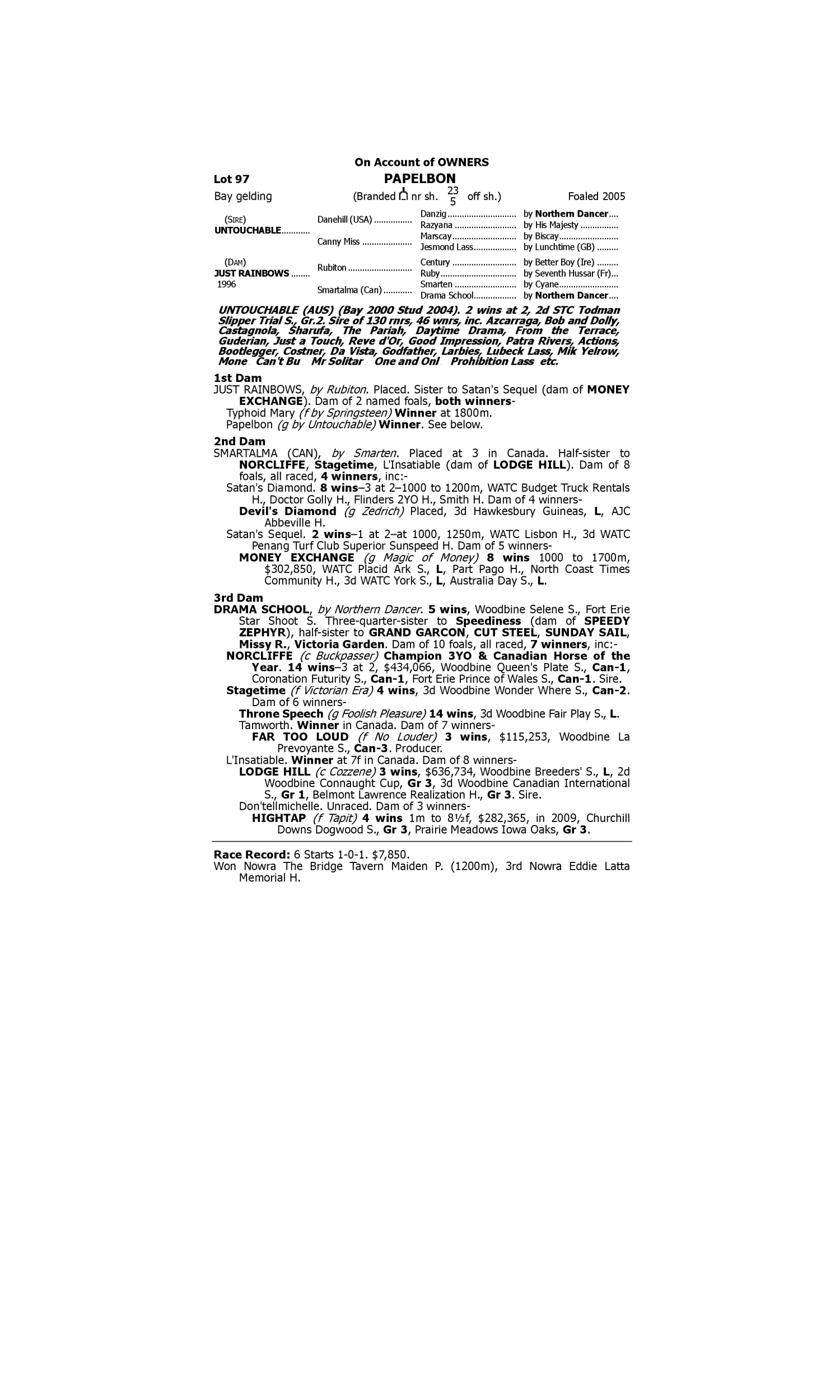 Sparta Dame (2006.f. by Lord Dane-Belle de Sparta, by Spartacus-Barbados Belle). 1st Bunbury TC Bunbury Holden AFM V8 H. Onalar (2002.g. by Latarmiss-Cona Belle, by Conquistarose-Chantilly Belle). 1st BRC (Doomben) Volvo Australia H. Tio Rossa (2006.f. by Testa Rossa-Tio Belle, by Zabeel-Tio Violet). 1st MVRC (Moonee Valley) Ready Workforce H.
