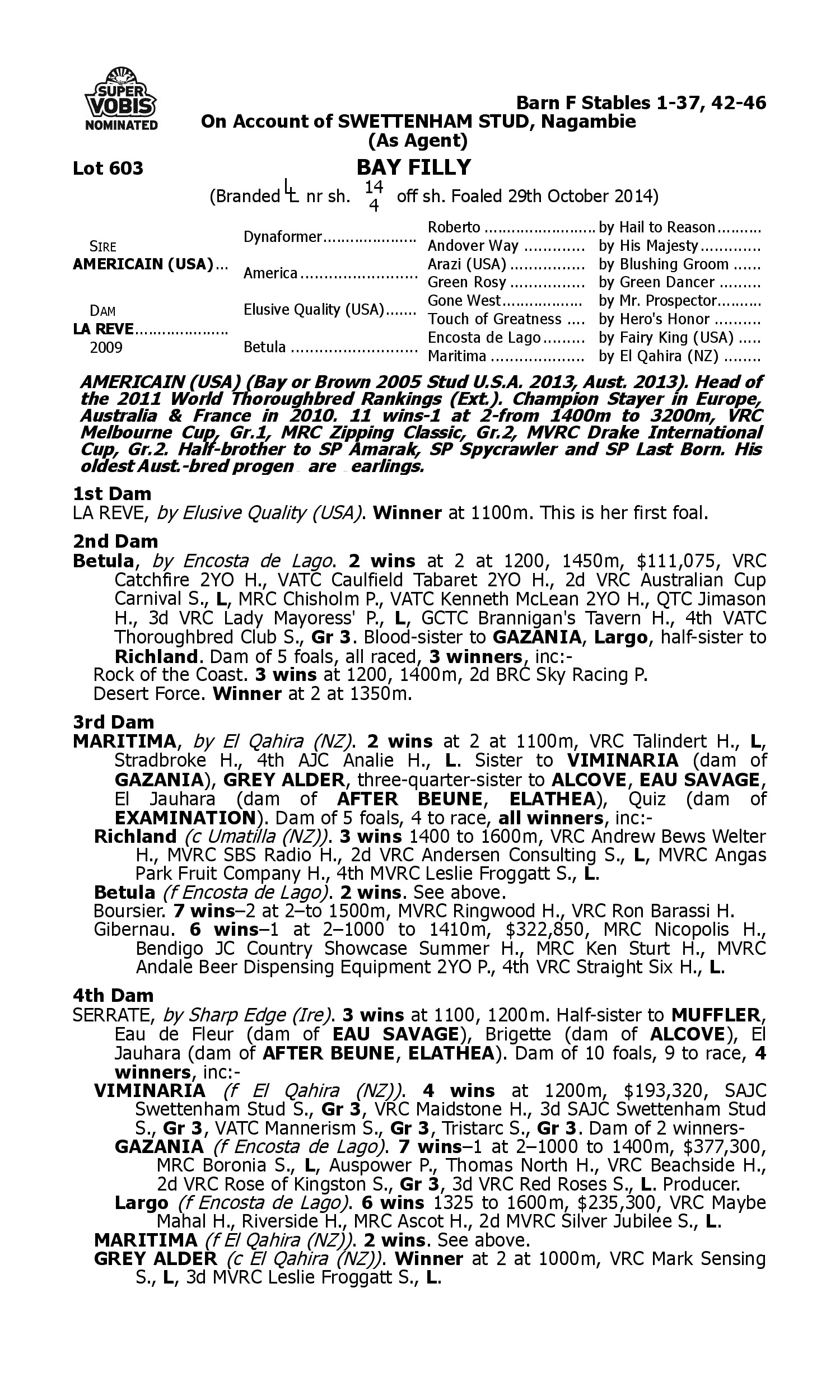 1st Dam Gratwick (2013.g. by Reward for Effort-Kuda Cepat, by O'Reilly-Hucktooie). 2016-02-06 3rd MRC (Caulfield) Chairman's S. Gr.3 3rd Dam Tibrogargan Miss (2012.f. by Monashee Mountain-Miss Raffin Dane, by Special Dane-Hi Raffin). 2015-12-19 1st GCTC (GCTC) Optima Wealth Solutions H.