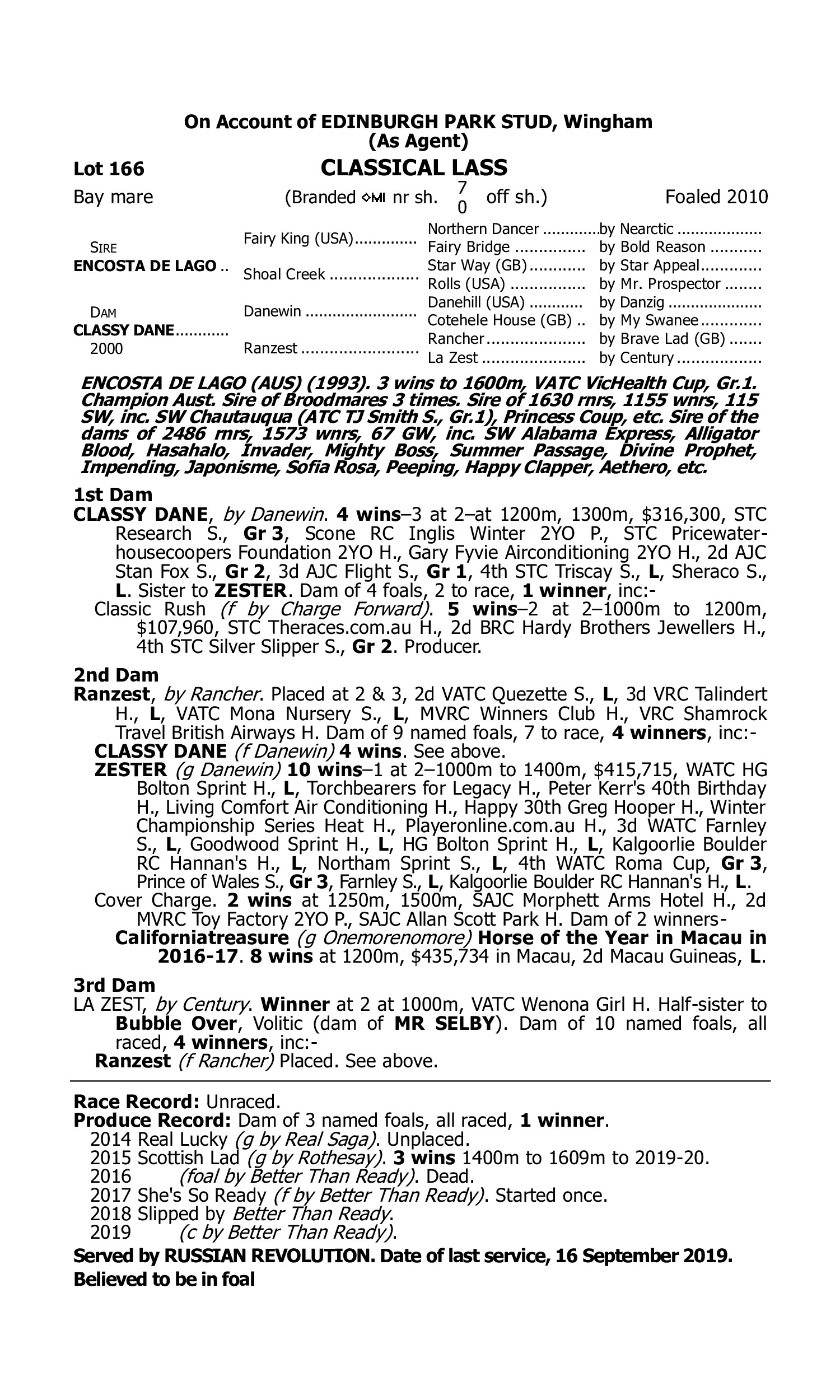 1st Dam Planet Warrior (2015.g. by So You Think-Fantastic Angel, by Howbaddouwantit-Grandiose). 2020-04-14 1st Rockhampton JC Final Countdown 2020 Cys Maiden P. 2020-04-28 2nd Mackay TC Champion C Stud H. 2020-05-05 3rd Rockhampton JC Spotlightonregion4 H.