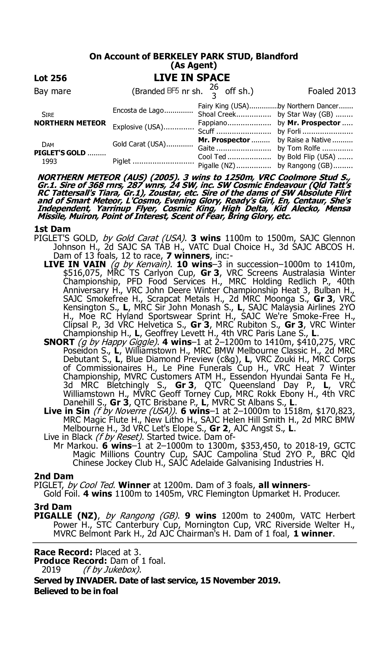 Out of mare Florida Dream (2015.g. by Sebring-Live and Dream, by Rock of Gibraltar-Bourgeois). 2020-04-18 1st Ararat TC TM Slattery H. 2020-04-14 2nd Sale TC Social Distancing Please H. 2020-05-07 3rd Werribee RC Tobin Brothers H. 1st Dam Enigma (2016.f. by Time for War-Oreznad Princess, by Danzero-Snow Queen). 2020-04-09 1st Wyong RC SES Volunteers Thank You Maiden H.