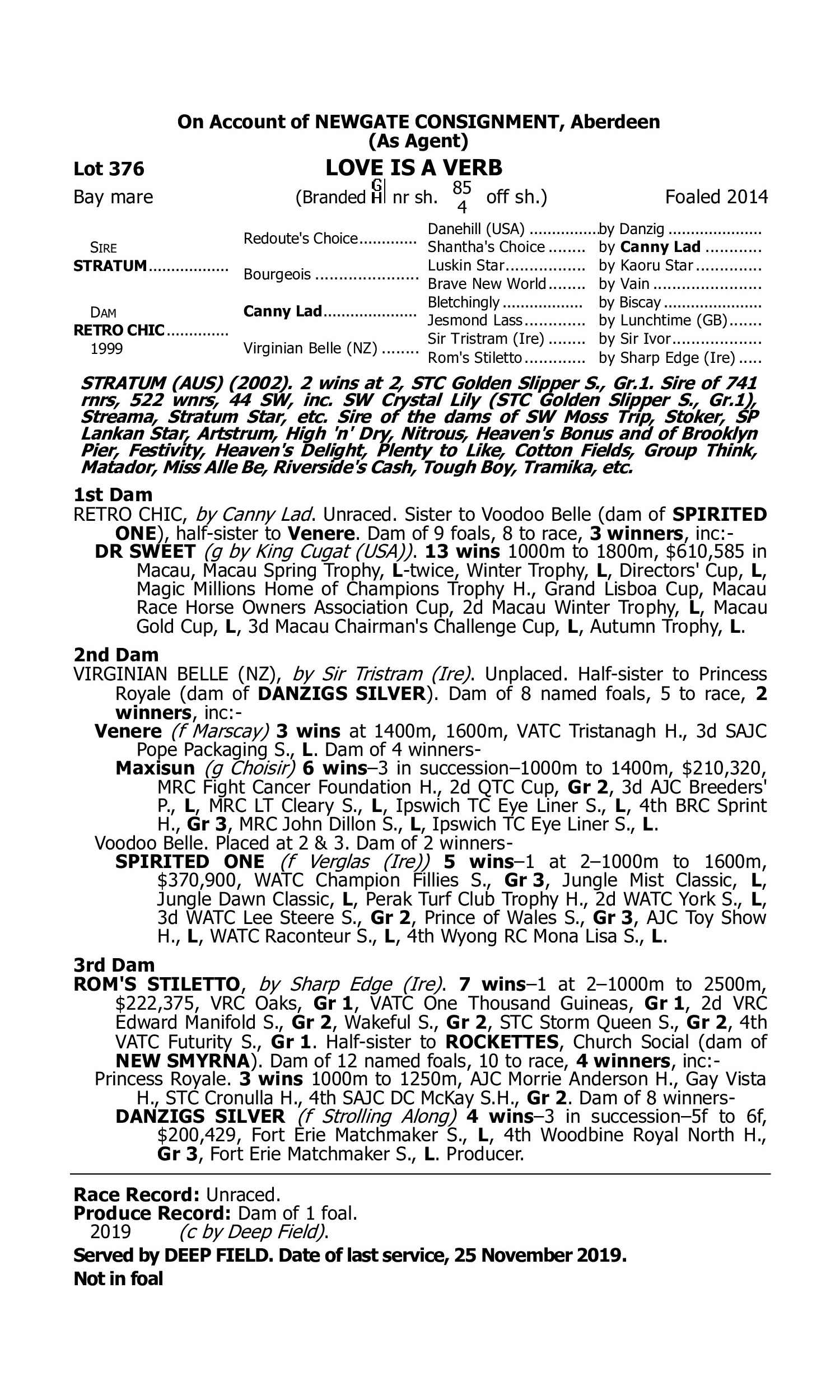 1st Dam Victoriam (2015.g. by I Am Invincible-Quality Impulse, by Elusive Quality-Compulsion). 2020-04-05 1st HKJC Homestead H. Chia - Sweet Angeline (Sing.) (2016.f. by Rubick-Mulu Miss, by Flying Spur-Bold Demand). 2020-04-03 1st Singapore TC Class 4 H.