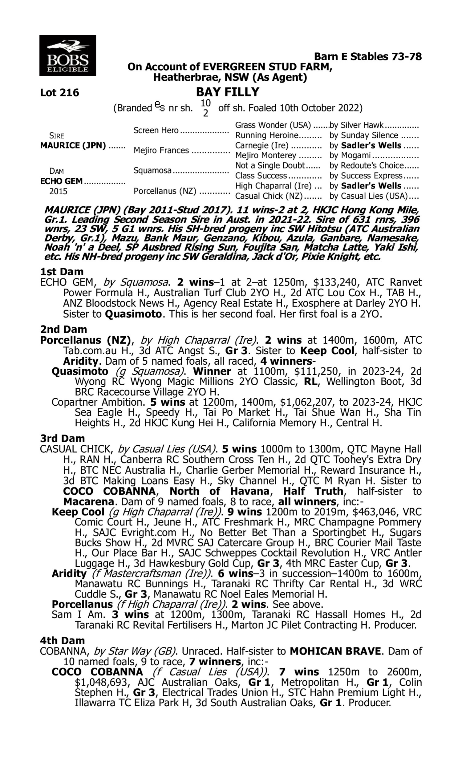 1st Dam Tobiwashi (2019.f. by Tosen Stardom-Eagles Destiny, by Snippetson-Rising Eagle). 2024-03-16 3rd SAJC (Morphettville) Triple M H. You are King (2017.g. by So You Think-Eagles Destiny, by Snippetson-Rising Eagle). 2023-12-30 2nd GCTC (Beaudesert) TAB 2YO Calcutta Raceday H. 2nd Dam AIR ASSAULT (2020.g. by Justify-Elegant Eagle, by Zabeel-Rising Eagle). 2024-03-11 1st SAJC (Morphettville) Morphettville Guineas L 2024-03-23 1st SAJC (Morphettville) Thomas Farms H. 2024-02-24 4th SAJC (Morphettville) City of Marion S. L COSMO KURANDA (2021.c. by Al Ain-Southern Speed, by Southern Image-Golden Eagle). 2024-03-03 1st Nakayama Hochi Hai Yayoi Sho Deep Impact Kinen Gr.2 Cadetship (2019.g. by Merchant Navy-Elegant Air, by So You Think-Elegant Eagle). 2024-02-28 1st ATC (Rosehill) Sharp EIT Solutions H.