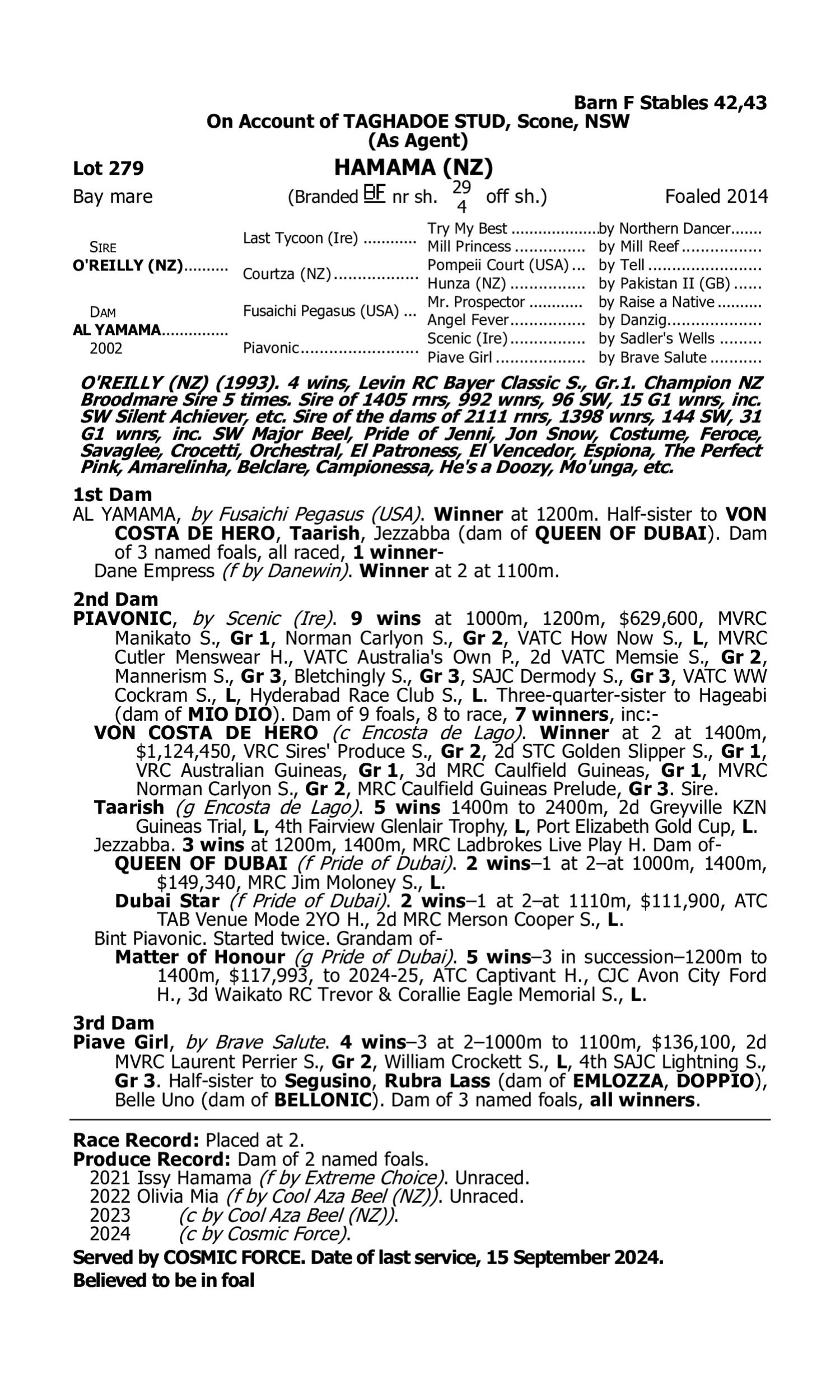 1st Dam Ready for the Trip (2020.g. by Better Than Ready-Pilgrim, by Danehill-Briscay). 2025-06-07 2nd Toowoomba TC Mitch Wilson Maiden H. 2nd Dam SALOON BAR (2019.g. by Sessions-Paris Cracker, by Viscount-Paris Petard). 2025-04-12 4th WATC (Ascot) Roma Cup Gr.3 2025-05-11 4th Northam S. Gr.3 Blue Rocket (2021.f. by Blue Point-Catherine Wheel, by Rogano-Paris Cracker). 2025-04-06 1st Geraldton TC Emu Creek Gardens H.