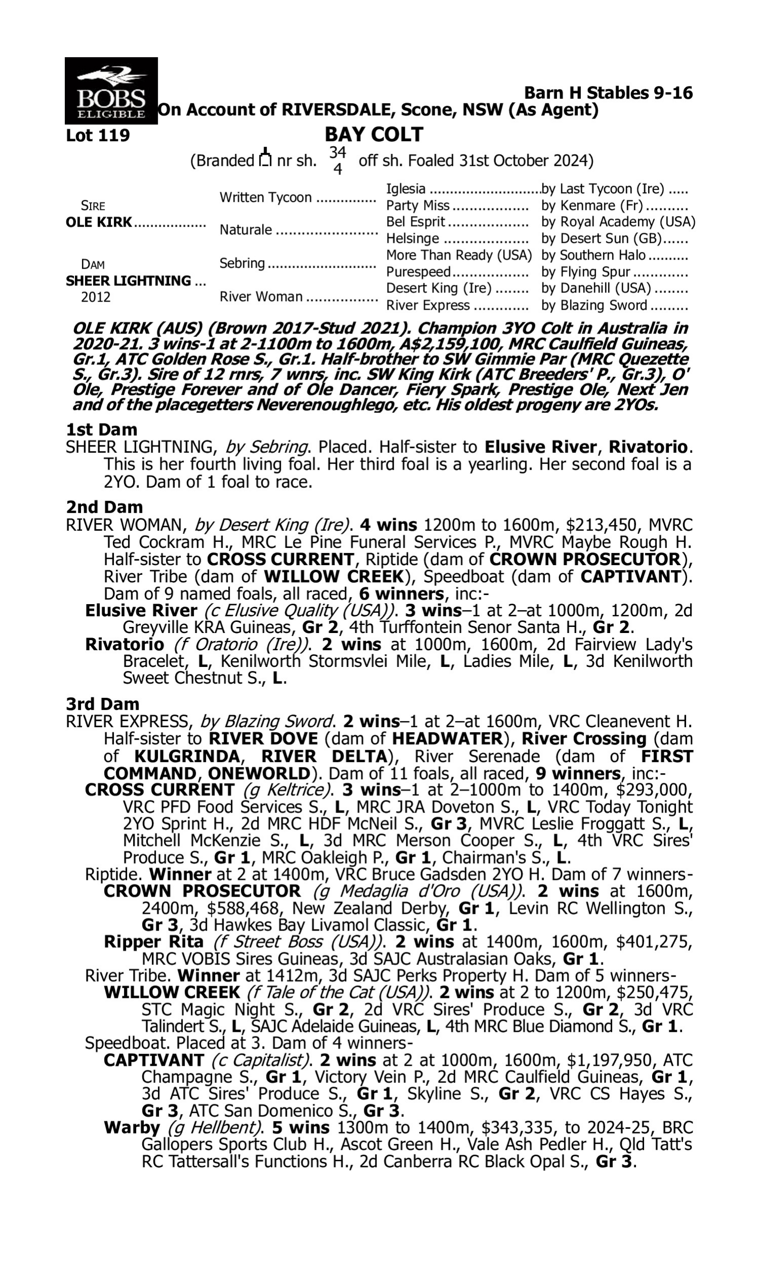 1st Dam O'so Demanding (2020.f. by Written Tycoon-She's Demanding, by Sebring-Demanding). 2025-04-20 2nd Mudgee DRC Easter H. 2nd Dam Ellipsis (2021.f. by Written Tycoon-Rare Occurrence, by Star Witness-Sister Phenomenon). 2025-04-21 1st ATC (Canterbury) Exceedance H.