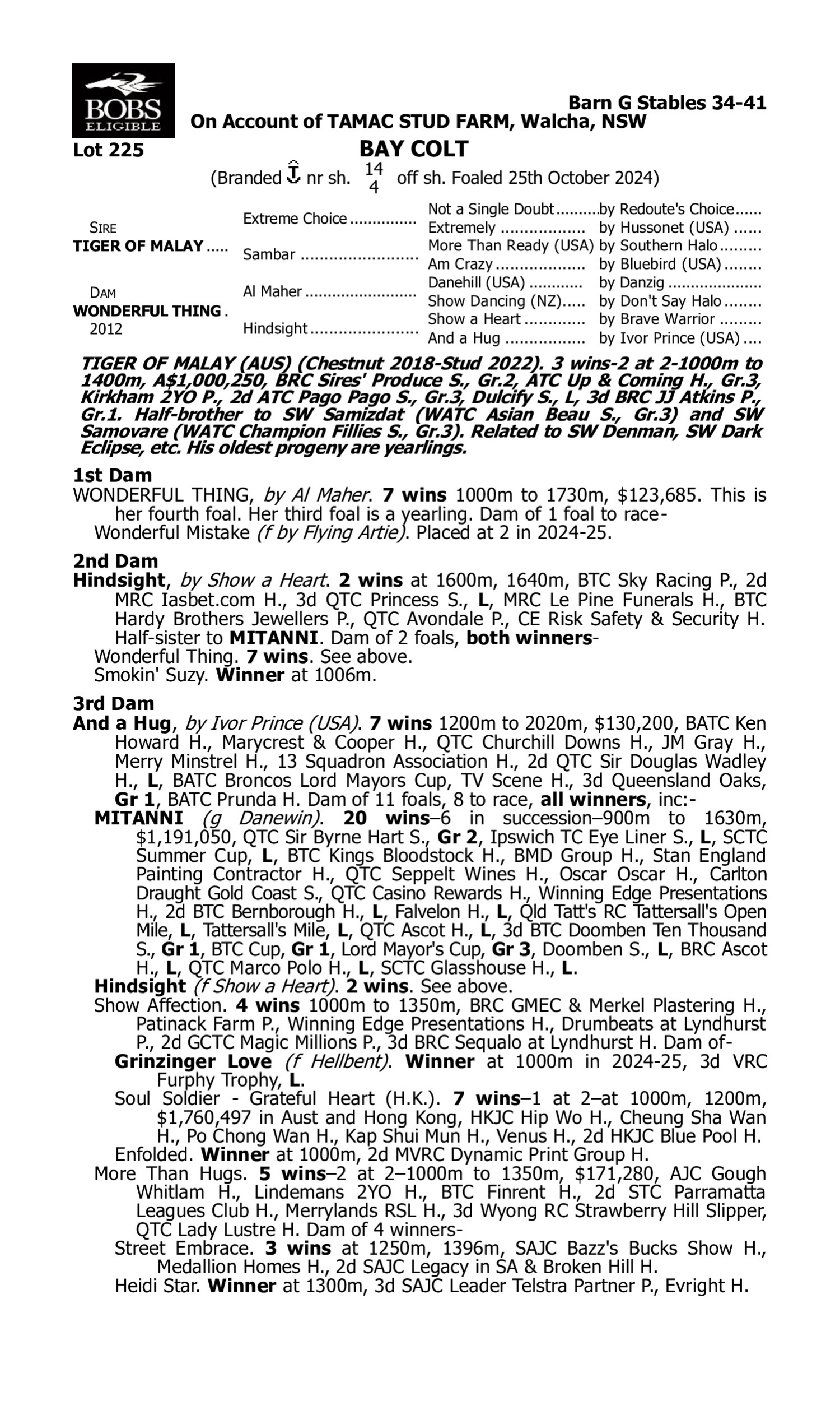 3rd Dam PING PONG (2020.c. by Roger Rocket-Quiet Alice, by Quiet American-Darling Alice). 2025-05-18 3rd La Rinconada Clasico Juan Arias L REGAL ZEUS (2020.g. by Zoustar-Quiet Kitten, by Kitten's Joy-Quiet Alice). 2025-04-12 1st Bendigo JC Golden Mile L SCENIC POINT (2022.f. by Written Tycoon-Ludicrous Mode, by Snitzel-Nothin But a Dream). 2025-04-05 1st MRC (Caulfield) Redoute's Choice S. L
