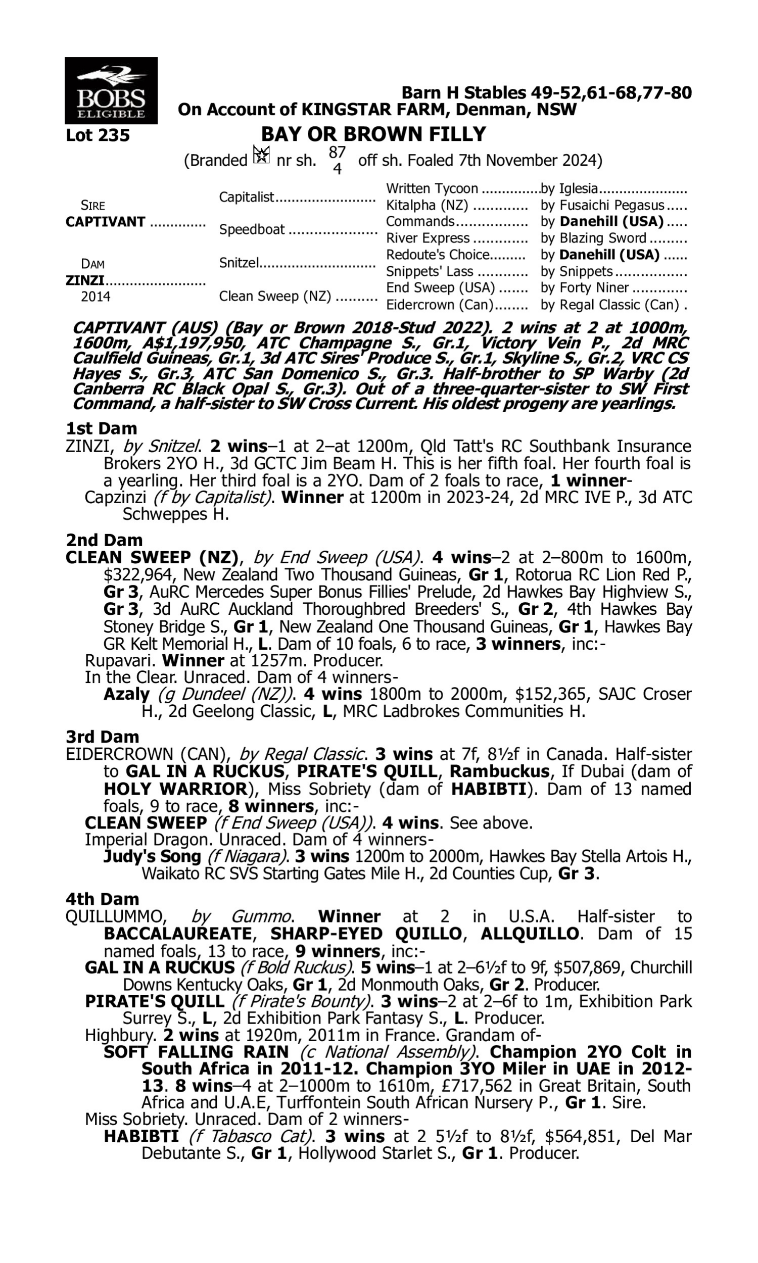 1st Dam Acapulco Girl (2021.f. by Contributer-Zihuatanejo, by Dylan Thomas-Euphoria). 2025-04-21 1st Ipswich TC (Ipswich) Schweppes Maiden H. 2025-05-07 2nd BRC (Eagle Farm) Ladbrokes H. 2nd Dam JASMIN ROUGE (2021.f. by Dundeel-Sweetener, by Snitzel-Negotiate). 2025-03-29 4th VRC (Flemington) Sunlight Classic L 3rd Dam Buffalo (2022.g. by Written By-Contributing, by Foxwedge-Blessingindisguise). 2025-04-05 3rd ATC (Randwick) Sires' Produce Gr.1 Ready to Charge (2020.c. by Gimmethegreenlight-San Fermin, by Charge Forward-Choice Blend). 2025-04-12 1st Turffontein Simon Rahilly and Lawrence Riley H. WITHIN THE LAW (2022.f. by Lucky Vega-Contract Signed, by Dundeel-So Much Joy). 2025-04-19 2nd ATC (Randwick) Champagne S. Gr.1 2025-04-12 3rd ATC (Randwick) Percy Sykes S. Gr.2 Lux Libertas (2020.f. by Almanzor-Miss Fi, by Makfi-Paloma). 2025-05-10 3rd Rotorua S. Gr.3