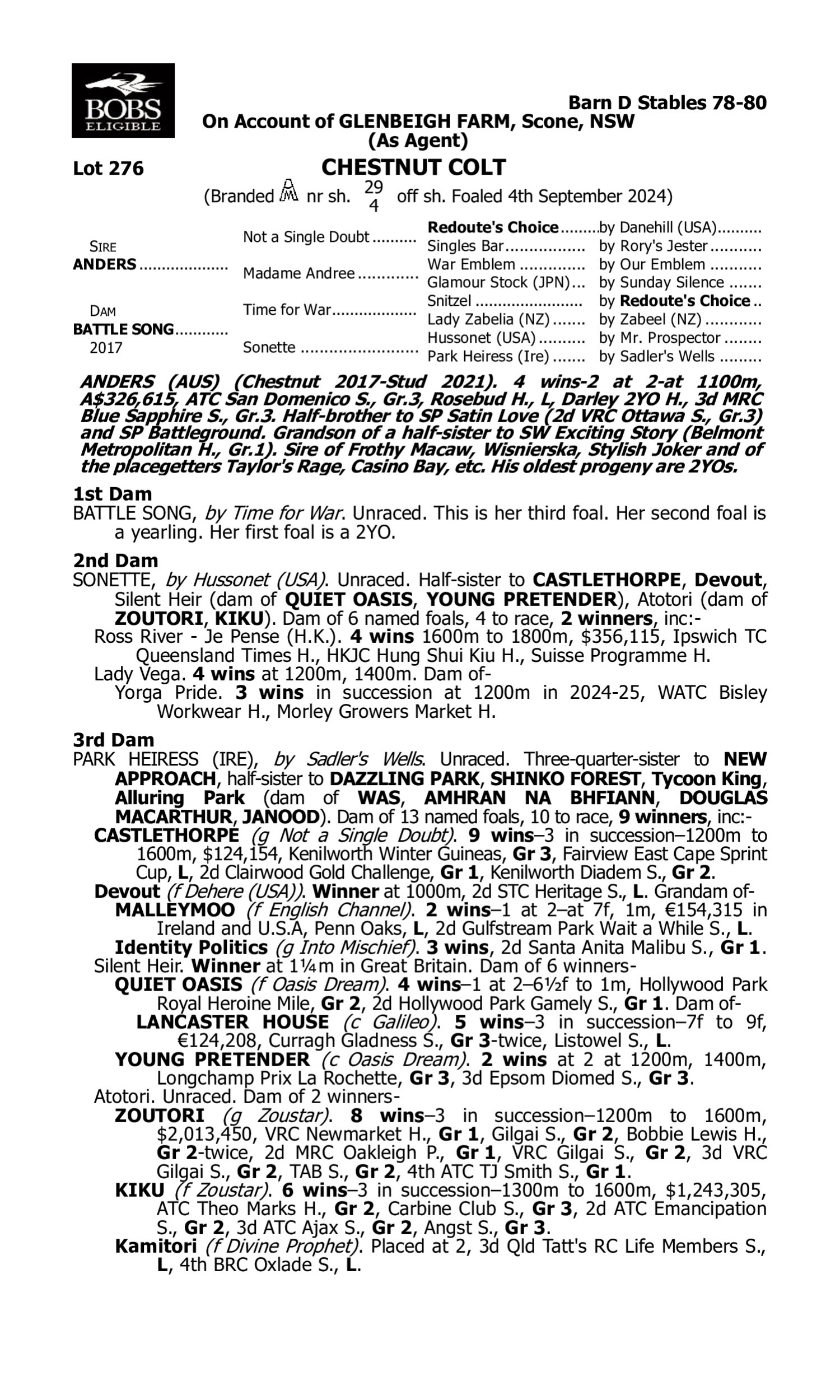 Lot 275 has pedigree updates since the release of the catalogue.