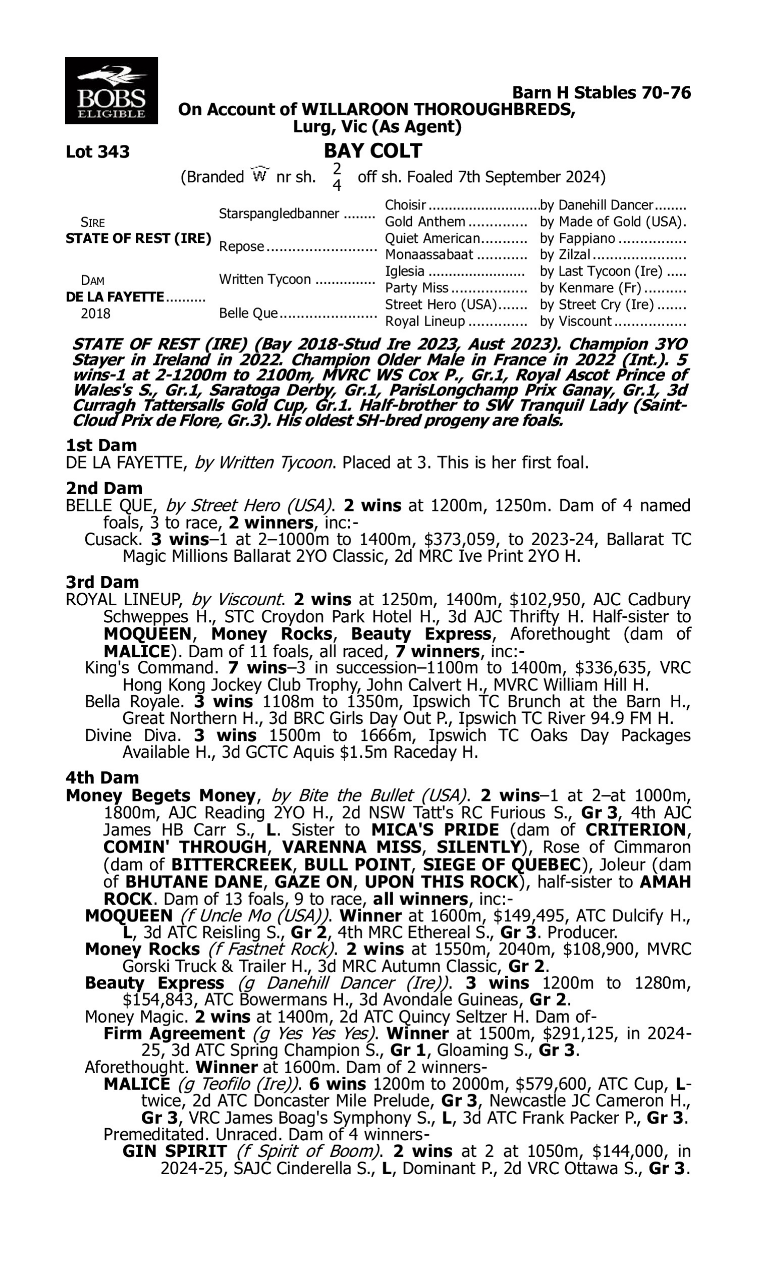1st Dam Unriddle (2020.g. by Encryption-Darook Park, by Darci Brahma-Silk Ending). 2025-06-02 3rd Southside Racing Frankston Sand Soil Mix Maiden P. 2025-05-16 3rd Werribee RC Centrals Football Club Maiden P. 3rd Dam RAINE ELIZABETH (2020.f. by Meal Penalty-Rouge, by Privately Held-Glinka). 2025-04-27 1st Monterrico Clasico Velocidad Gr.3 2025-04-06 1st Monterrico Clasico Junta Ejecutora de la Ley 2025-05-24 1st Monterrico Clasico Dardanus 2025-05-04 1st Monterrico Clasico Combate del Dos de Mayo PRINCESA DAYNE (2022.f. by Muwaary-Rouge, by Privately Held-Glinka). 2025-04-20 1st Monterrico Clasico Roberto Alvarez Calderón Granados L
