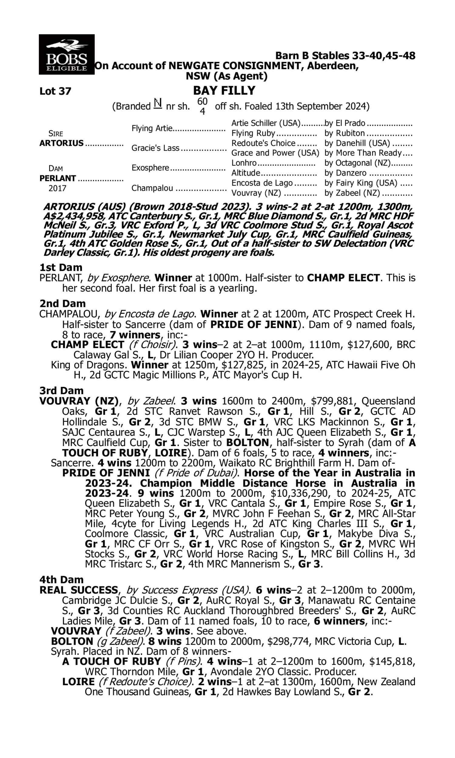 1st Dam (Perfect) Pairing (2019.g. by Pierro-Aonair, by Fastnet Rock-Perfect Persuasion). 2025-05-07 1st HKJC French May Trophy 2025-04-16 2nd HKJC Bellflower H. 2025-05-28 2nd HKJC Loire H. Amizetta (2020.f. by Dundeel-Aonair, by Fastnet Rock-Perfect Persuasion). 2025-04-12 2nd SAJC (Morphettville) Fotobase Group H. 2nd Dam Madame Magic (2019.f. by Real Impact-Defender, by Redoute's Choice-Alinghi). 2025-05-03 1st WATC (Ascot) Morley Growers Market H. 2025-06-02 1st Northam RC Western Australian Day Cup SPICY MARTINI (2021.f. by Justify-Extra Olives, by Redoute's Choice-Line Honours). 2025-06-04 1st BRC (Doomben) Fred Best Classic Gr.3 2025-04-26 1st BRC (Eagle Farm) Mick Dittman P. L
