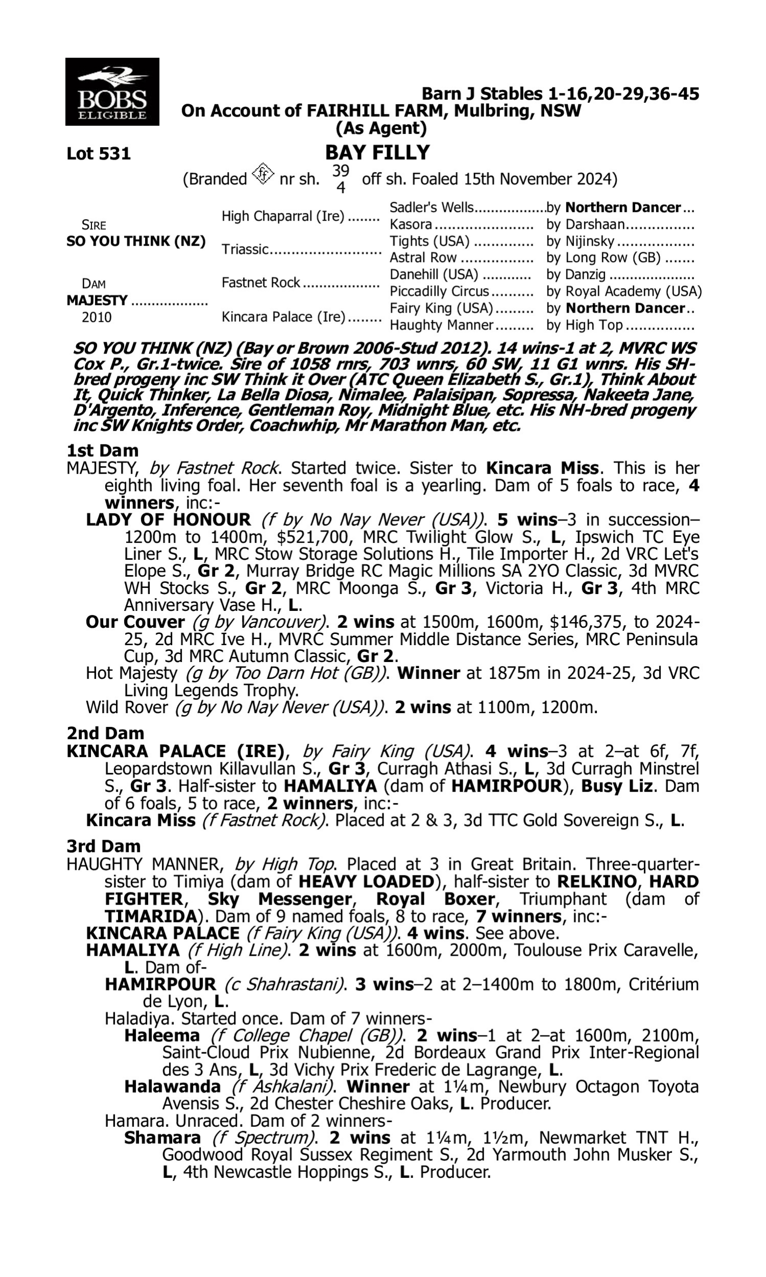 2nd Dam WATCHME WIN (2020.g. by Harry Angel-Watchmespin, by Sepoy-Tobouggie Woogie). 2025-04-26 1st SAJC (Morphettville) John Hawkes S. Gr.3 2025-03-29 1st SAJC (Morphettville) Adelaide Racing Carnival H. 2025-05-31 4th MRC (Caulfield) Bel Esprit S. L 3rd Dam Sabaj (2021.g. by Manhattan Rain-Bouzy, by Uncle Mo-Champagne Jane). 2025-04-26 2nd SAJC (Morphettville) Tobin Bronze S. Gr.2