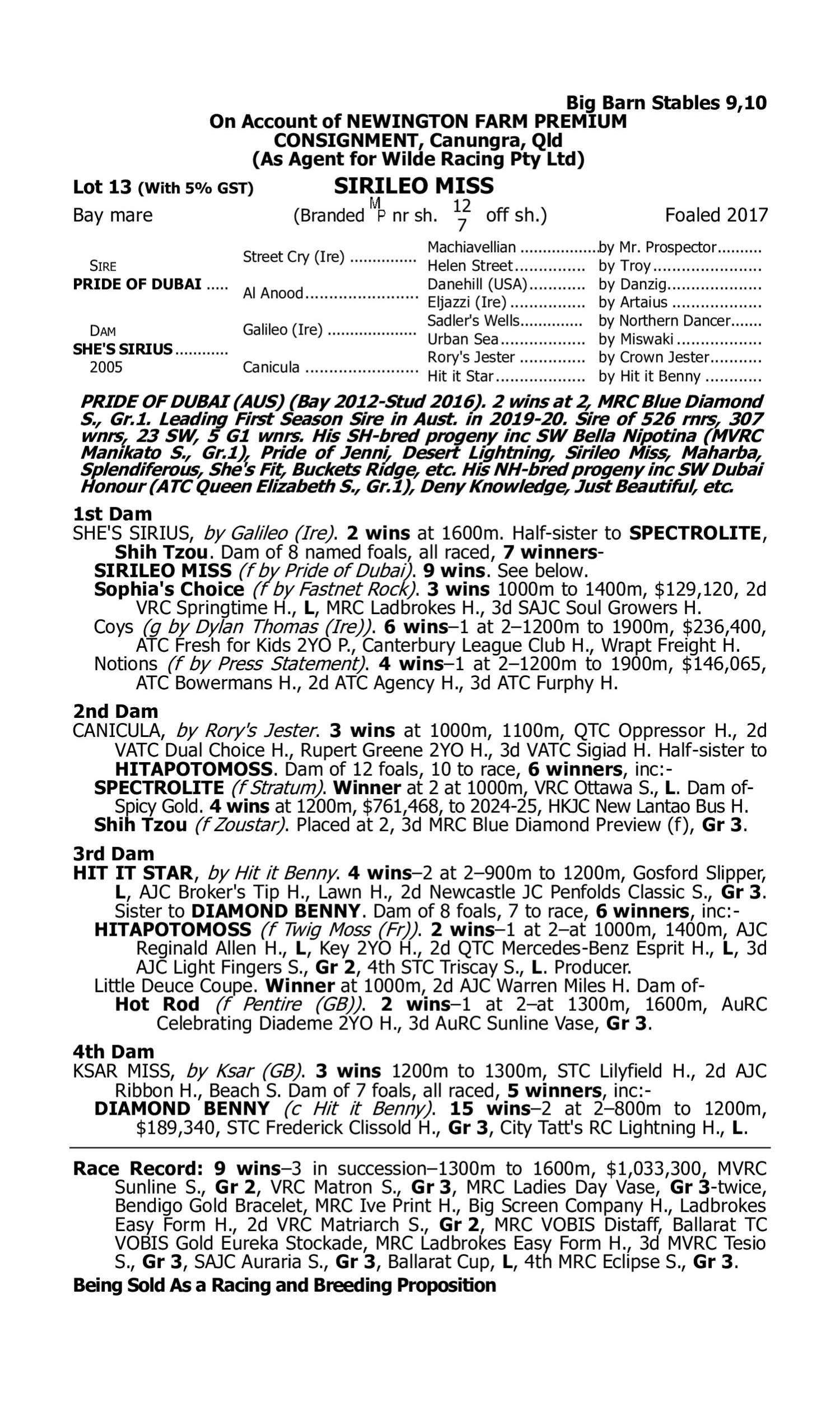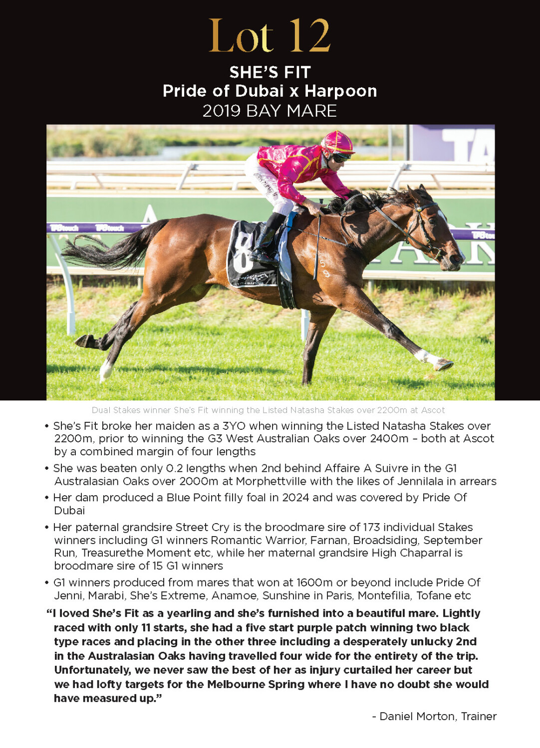 2nd Dam FANGIRL (2018.f. by Sebring-Little Surfer Girl, by Encosta de Lago-Special Harmony). 2025-04-12 1st ATC (Randwick) Queen of the Turf S. Gr.1 Toropa (2020.f. by Toronado-Europa Point, by Rock of Gibraltar-Gambei). 2025-04-19 1st WATC (Ascot) Join a Syndicate H. Typhoon Harmony (2016.g. by Written Tycoon-Jubilant Harmony, by Redoute's Choice-Special Harmony). 2025-05-02 1st Southside Racing Stables Plus H. Rally the Troops (2021.g. by Blue Point-Reveille, by High Chaparral-Europa Point). 2025-06-04 1st WATC (Northam) Countrywide Insurance H. 2025-05-14 1st Pinjarra RC Tabtouch H.