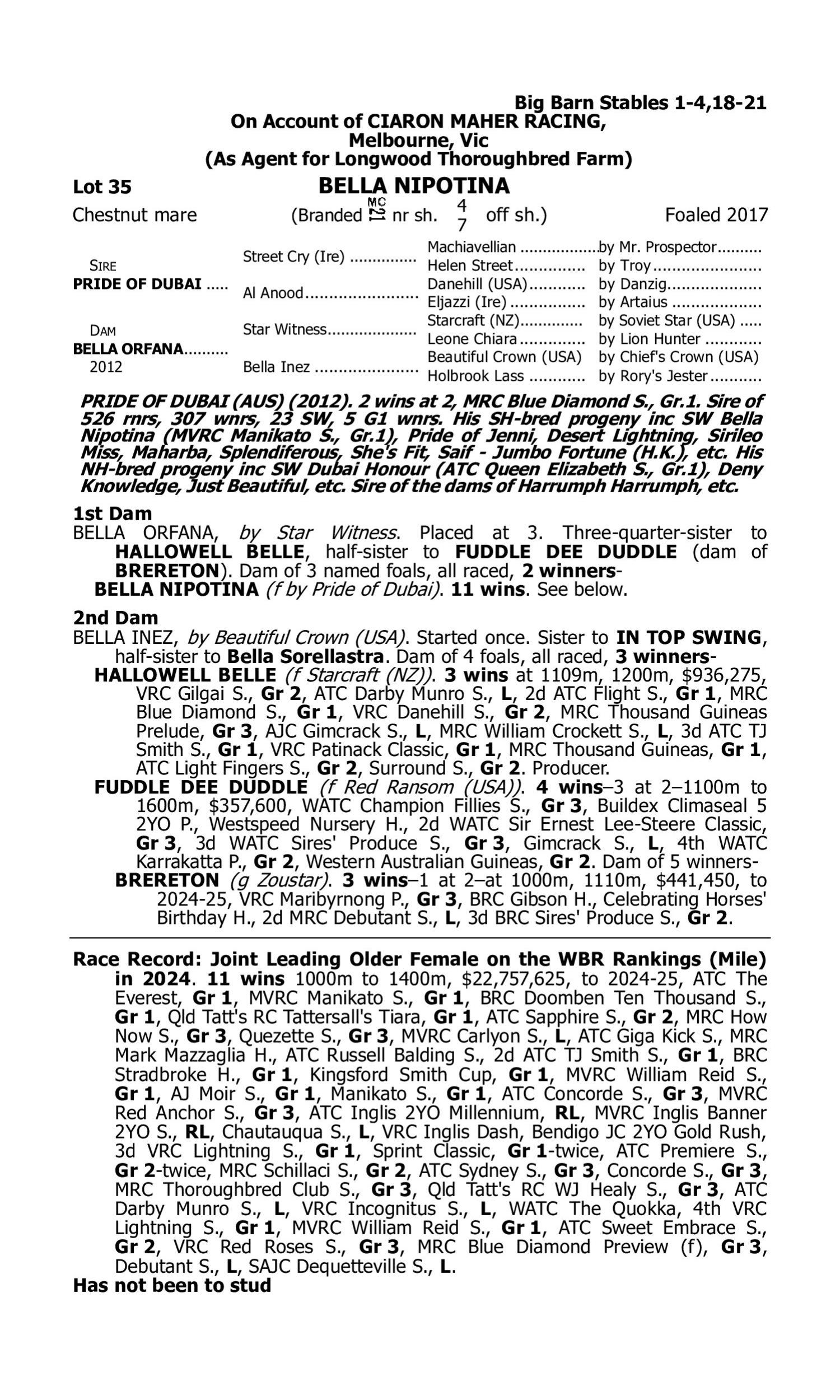 Subject Horse BASILINNA (2020.f. by Staphanos-So Royal, by Shinko King-Queen of the Cape). 2025-05-17 1st VRC (Flemington) Andrew Ramsden S. L 2025-05-03 2nd SAJC (Morphettville) Port Adelaide Cup L 2025-04-18 2nd Echuca RC Country Oaks 1st Dam Shangri la Impact (2021.f. by Staphanos-So Royal, by Shinko King-Queen of the Cape). 2025-05-15 1st Hawkesbury RC Mineral Magic Soilsmart P. 2025-05-22 1st Goulburn DRC JCF Contracting H. 2025-04-30 2nd ATC (Canterbury) Broadsiding Maiden H. 2025-04-15 2nd Illawarra TC Time to Reign Farm Maiden H.