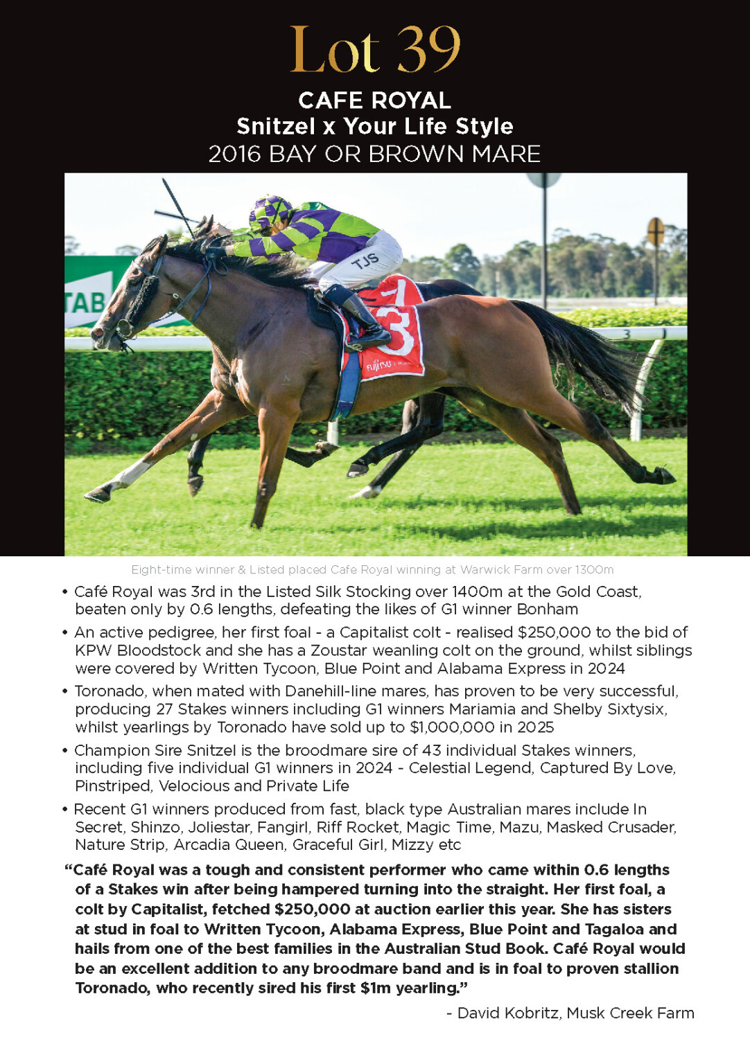 1st Dam Bohemian Art (2021.f. by Deep Field-Your Life Style, by Hussonet-Monsoon Wedding). 2025-04-26 2nd Newcastle JC Dailey Family Funerals Maiden H. 2nd Dam Watermelon (2020.g. by Russian Revolution-Quench the Thirst, by Encosta de Lago-Monsoon Wedding). 2025-04-26 1st GCTC Thirsty Camel H. 2025-04-05 1st GCTC Silks Under the Stars April H. Ka Ying Attack (2021.g. by Too Darn Hot-Refreshing, by Stratum-Quench the Thirst). 2025-05-31 1st HKJC Fo Tan H. 3rd Dam Tacito (2020.g. by Showtime-Without Saying, by Sepoy-Unspoken Choice). 2025-04-10 1st Kyneton and Hanging Rock RC Sean Lawless H.