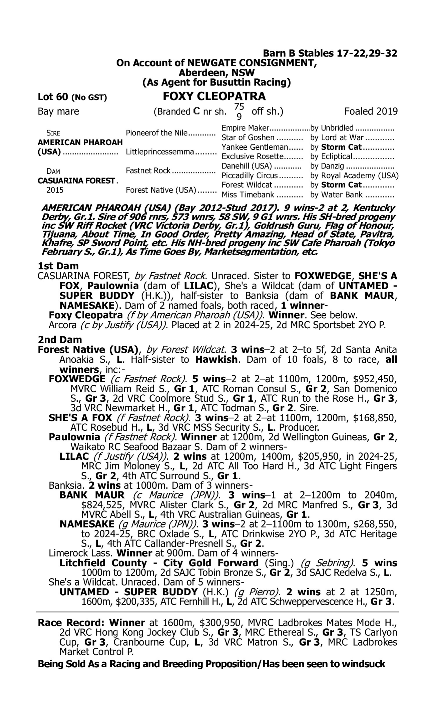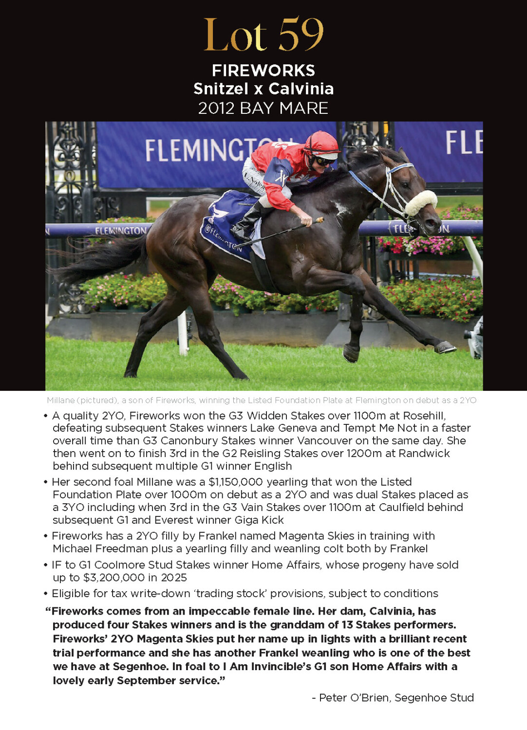 Out of mare MILLANE (2019.g. by Zoustar-Fireworks, by Snitzel-Calvinia). 2025-03-28 3rd Toowoomba TC King of the Mountain P. 1st Dam FRANCEE (2019.f. by Iffraaj-Calveen, by Canny Lad-Calvinia). 2025-05-17 1st Rangitikei Cup L 2025-04-05 3rd Auckland TR Cambridge Stud Easter Yearlings H. Multidarling (2019.g. by Shalaa-Stellar Vinia, by Redoute's Choice-Calvinia). 2025-04-23 2nd HKJC Flamingo Flower H. ARRAN BAY (2018.g. by All Too Hard-Stolen Girlfriend, by Canny Lad-Acacia Bay). 2025-05-10 2nd SAJC (Morphettville) Cummings S. Gr.3 2025-04-12 3rd Bendigo JC Golden Mile L Let's Get Down (2020.g. by Better Than Ready-Second Date, by Rothesay-Acacia Bay). 2025-04-05 1st SAJC (Morphettville) Skycity H. Victory Bay (2018.g. by So You Think-Clevedon Bay, by Redoute's Choice-Kosi Bay). 2025-05-24 1st Mount Isa RC Benchmark H. Indaza (2020.f. by I Am Invincible-Ektifaa, by More Than Ready-Stellar Vinia). 2025-04-21 1st Ipswich TC (Ipswich) Red Bull Australia H. Oakfield Jupiter (2021.f. by Toronado-Isle of Capri, by Street Cry-Kosi Bay). 2025-04-03 1st Wyong RC Ash and Sons Maiden H. 2025-04-25 1st Gosford RC Risk and Safety Solutions H.