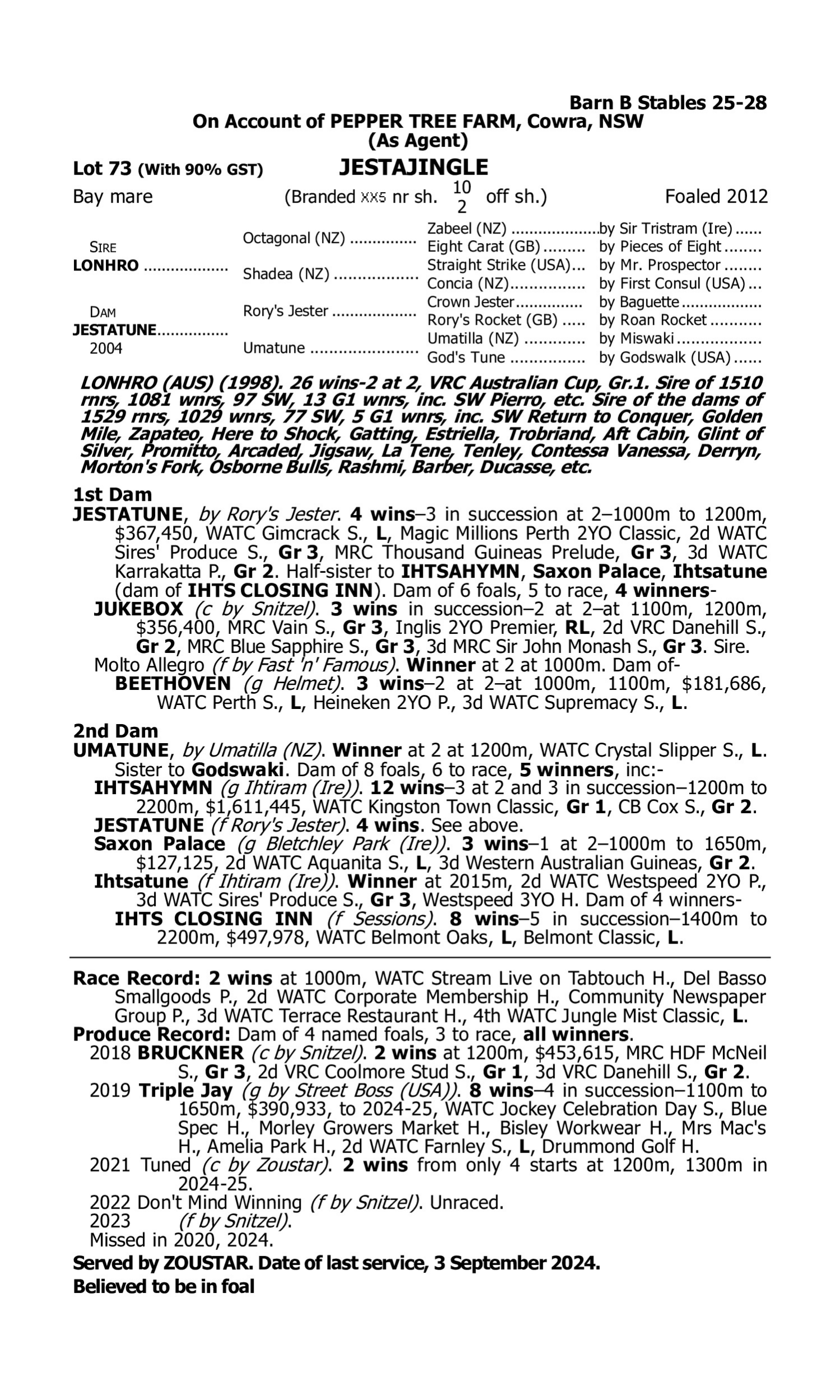 1st Dam WINGS OF SONG (2020.f. by Mendelssohn-Tortoni, by Strategic-Whisked). 2025-05-17 3rd VRC (Flemington) LV Lachal H. Signor Tortoni (2021.g. by Too Darn Hot-Tortoni, by Strategic-Whisked). 2025-05-22 2nd Goulburn DRC Homebase Real Estate Maiden P.