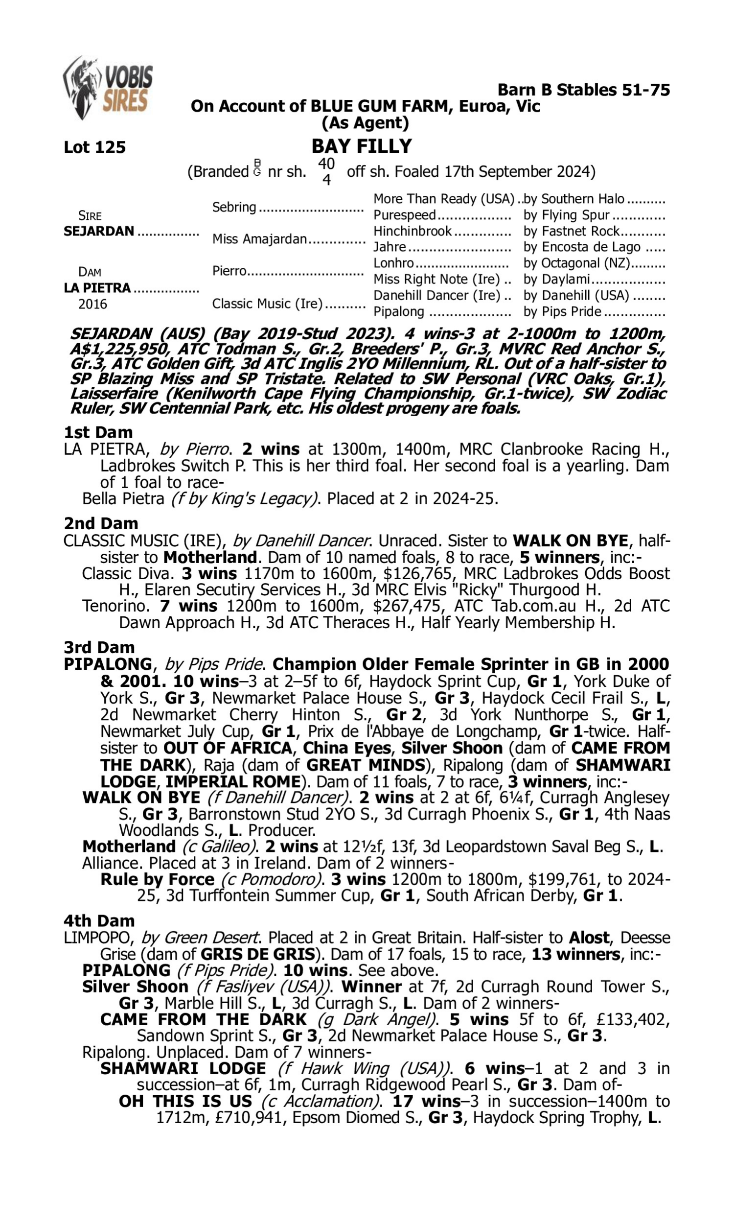 1st Dam Mysterious Master (2022.c. by Tagaloa-La Magique, by Magic Albert-Rose Pompadour). 2025-05-31 2nd Illawarra TC Race Against Suicide Maiden 2YO P. 3rd Dam Sueno (2021.f. by Camelot-Danehill's Dream, by Danehill-Summerosa). 2025-05-31 3rd York Bronte Cup Gr.3 DIAMOND RAIN (2021.f. by Shamardal-Dancing Rain, by Danehill Dancer-Rain Flower). 2025-06-27 1st Newcastle Hoppings S. Gr.3 2025-05-24 1st Haydock Hedge of Oak S. L CONTINUOUS (2020.c. by Heart's Cry-Fluff, by Galileo-Sumora). 2025-06-06 4th Epsom Coronation Cup Gr.1 OPPORTUNISTIC (2021.g. by So You Think-I'm Feeling Lucky, by Bletchley Park-Twinkle Toes). 2025-06-14 1st WATC (Bunbury) Raconteur S. L 2025-06-28 1st WATC (Pinjarra) Belmont Guineas L 2025-05-28 1st WATC (Pinjarra) Tabtouch Maiden P.