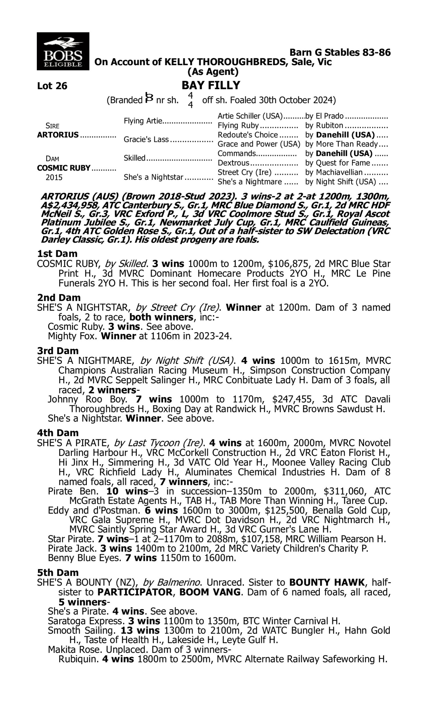 1st Dam Groovy Feeling (2020.g. by Cable Bay-Cooper's Girl, by Choisir-Little 'n' Cute). 2025-07-05 3rd HKJC Stevenson Cup 3rd Dam Dark Glitter (2020.f. by Spieth-Berning Affair, by Bernardini-Gold Fair). 2025-05-17 3rd Scone RC Dark Jewel Classic Gr.3