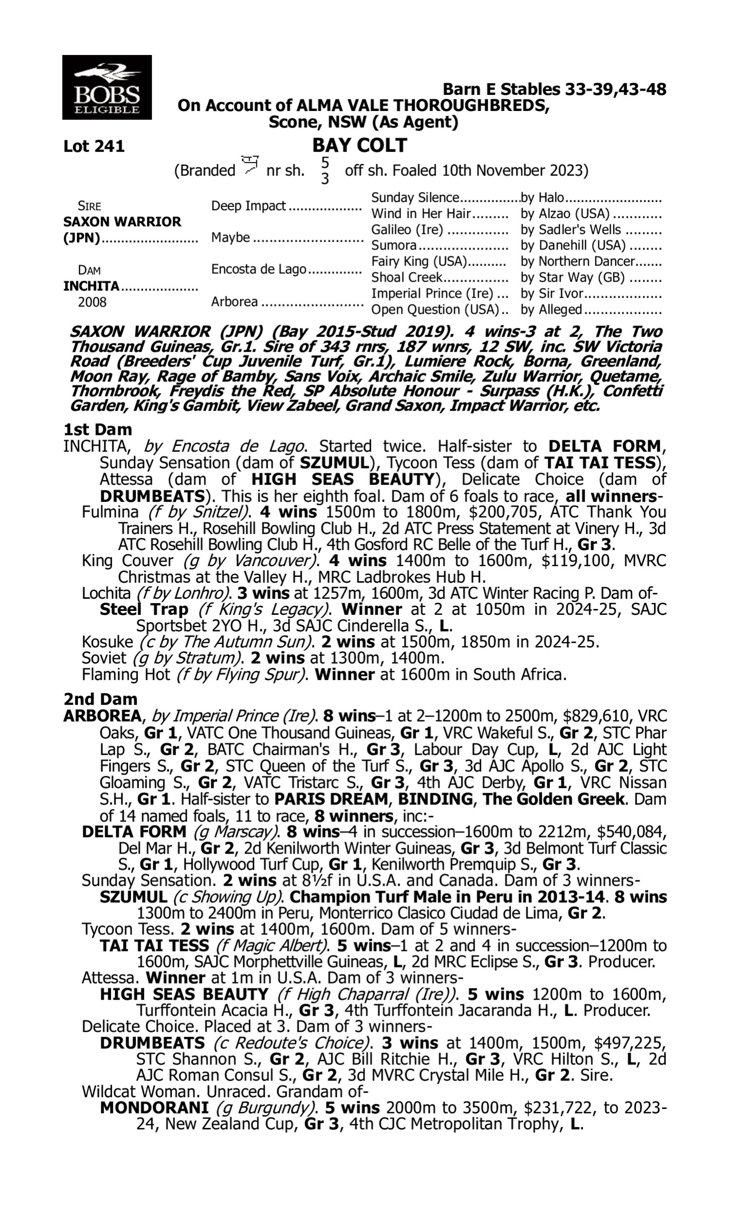 1st Dam Chemtrail (2021.g. by Cosmic Force-In Need I Am, by General Nediym-Emily Blue). 2025-05-08 1st Goulburn DRC Electel Services H. Fourthtimelucky (2021.g. by Prized Icon-Abbalanche, by Magnus-In Need I Am). 2025-05-19 1st Corowa RC Campbell's Wines Rutherglen H. Ilikesooboogie (2018.g. by Sooboog-Abbalanche, by Magnus-In Need I Am). 2025-04-05 1st Tomingley PRC Eric Pugh Memorial Maiden P.