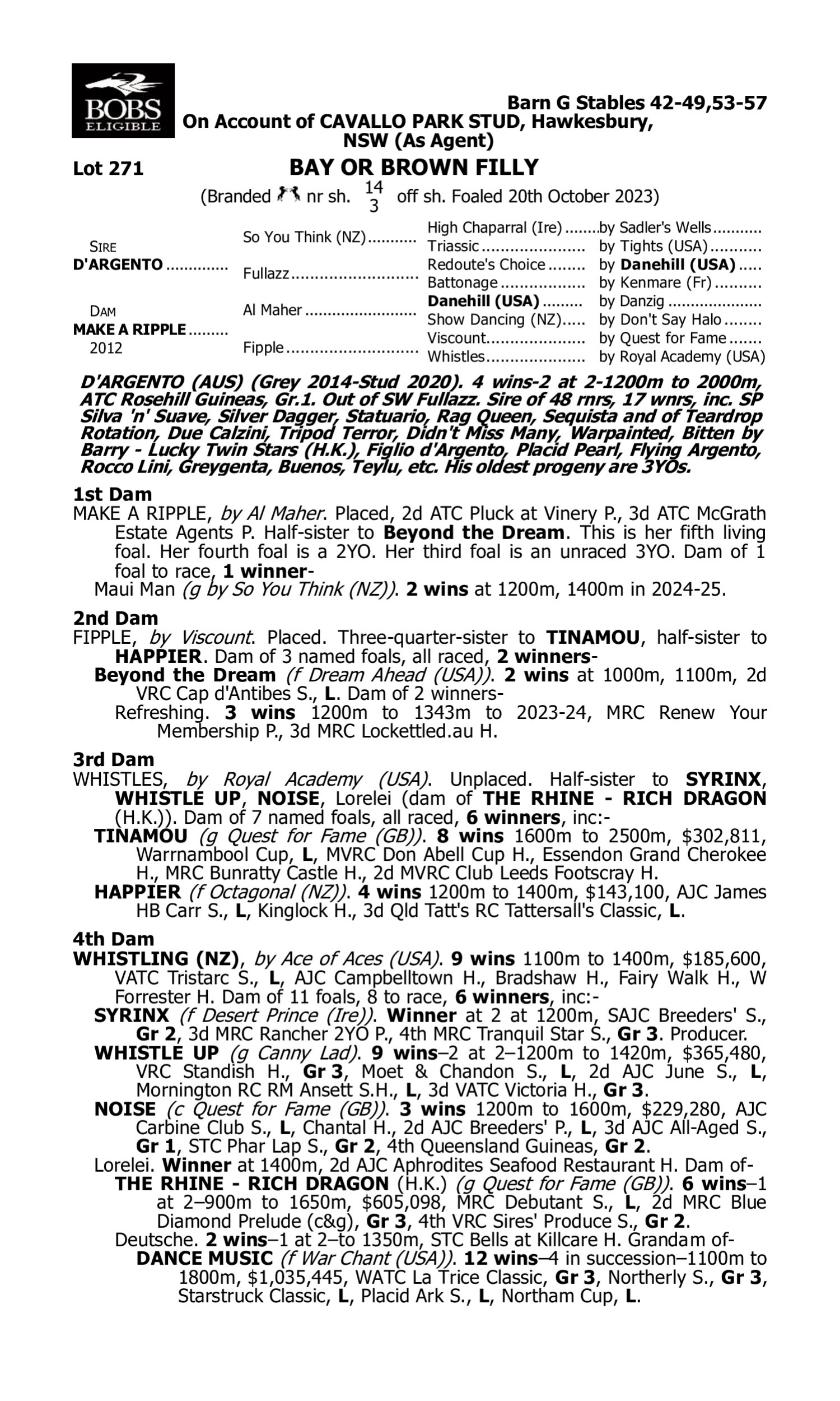 Note the colt has been moved to Widden Stud, Barn I 41-44, 52-60. Widden will be parading the colt for the sale.