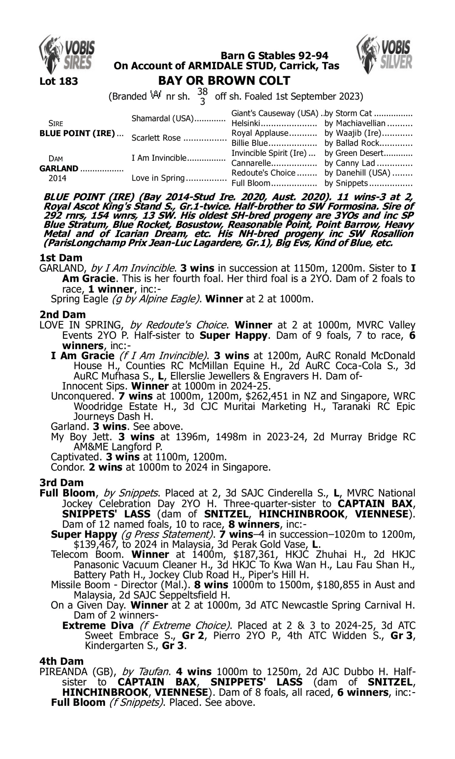 1st Dam Gamolina (2021.f. by Zoustar-Galina, by Smart Missile-Ballet d'Amour). 2025-03-15 2nd Geelong St Patrick's RC Irish Society Maiden P. 2nd Dam Wilbury (2019.g. by Capitalist-Miss Interiors, by Flying Spur-Ballet d'Amour). 2025-01-11 1st Wyong RC TAB Highway H. 2025-02-28 1st Orange JC Living Turf H. 2025-02-03 1st Dubbo TC Summer Sprint Series