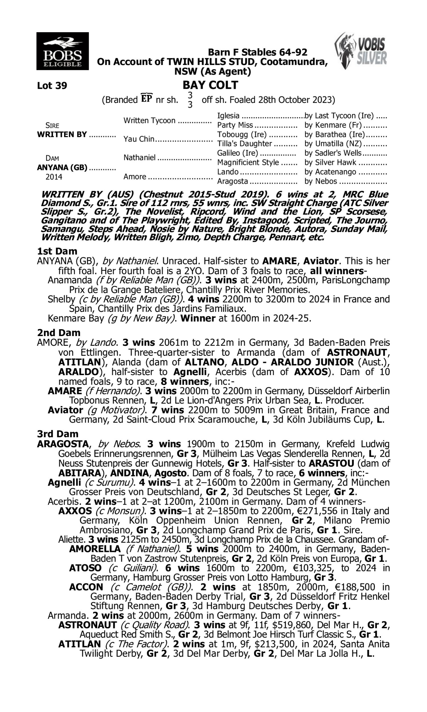 1st Dam Manta Ray Bay (2020.g. by Cable Bay-Anthelion, by Sepoy-Chiara). 2025-03-03 2nd Narrogin RC Drive Home With Cliff Maiden H. 2025-03-15 2nd Narrogin RC Tabtouch Maiden H. Marathia (2021.f. by Toronado-Anthelion, by Sepoy-Chiara). 2025-02-28 3rd Lockyer RC Ovarian Cancer Awareness Month Maiden P.