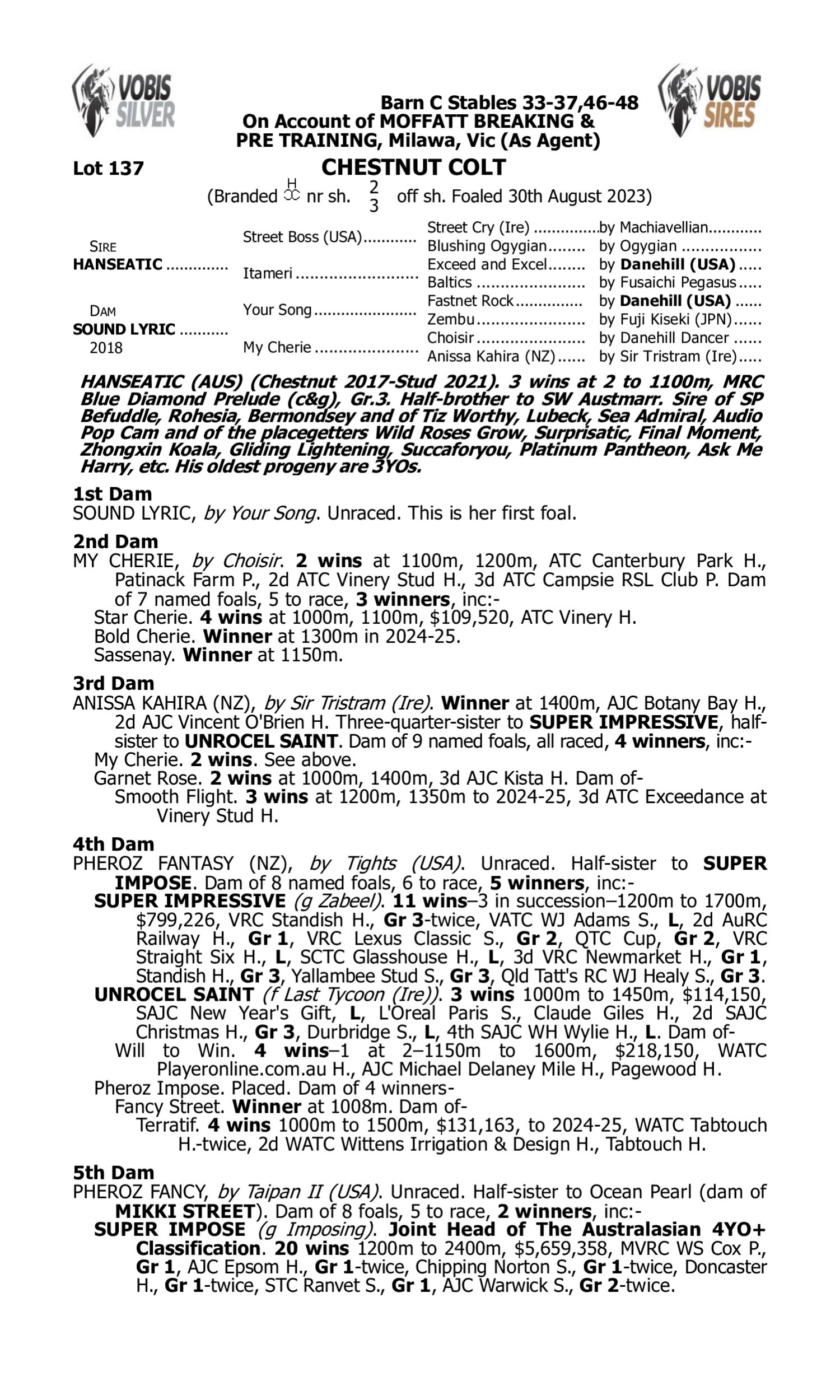 2nd Dam Benevento (2020.g. by Toronado-Papillon Rouge, by Fastnet Rock-Indian Dream). 2025-11-10 1st Mount Isa RC Steejo Press H. 3rd Dam Above the Clouds (2018.f. by Turn Me Loose-Indian Sky, by Stravinsky-Indian Dream). 2025-10-17 3rd Matamata Cup L