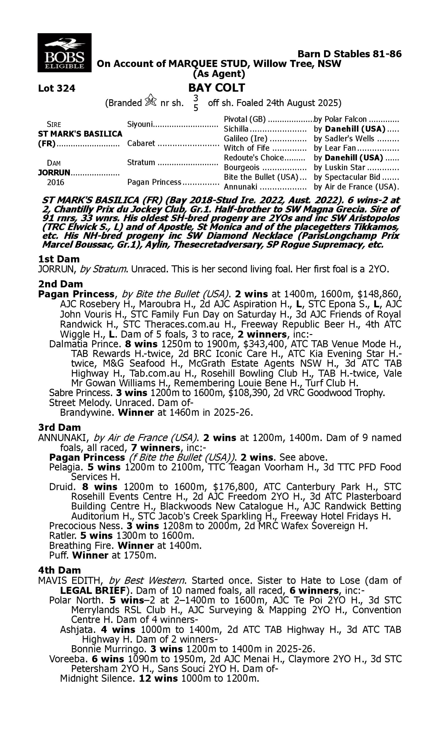1st Dam Moonlight Dream (2021.f. by Zoustar-Jolie Brise, by Fastnet Rock-Vestey). 2026-03-29 1st Murrumbidgee TC Visy Logistics H. 2nd Dam Fine Vintage (2019.g. by Supido-Winesearch, by Wanted-Vestey). 2026-04-01 1st ATC (Warwick Farm) Brave Smash at Yarraman H.