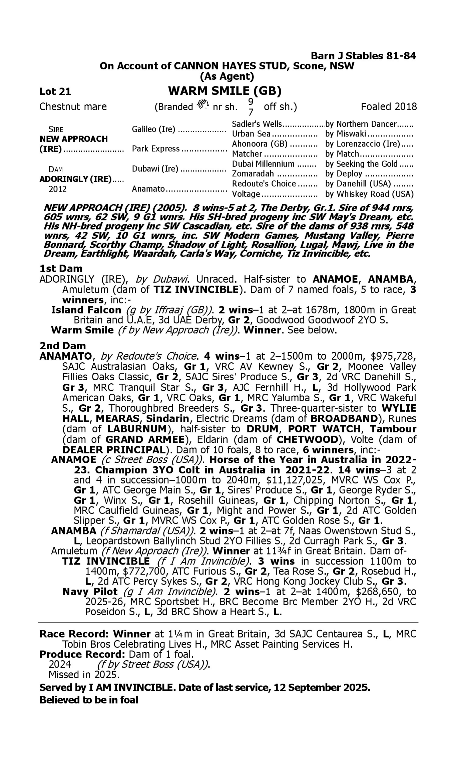 2nd Dam IDLE FLYER (2021.f. by Dundeel-Progressive, by Street Cry-Movin' Out). 2026-03-28 1st ATC (Rosehill) Emancipation S. Gr.2 3rd Dam BLUE DOOR (2023.f. by Stay Inside-Notting Hill, by Pierro-Monsoon Wedding). 2026-04-04 1st ATC (Randwick) Kindergarten S. Gr.3 MERIDIUS (2019.g. by Extreme Choice-Jardine, by Stryker-Casula Gal). 2026-04-04 3rd MRC (Caulfield) Victoria H. Gr.3