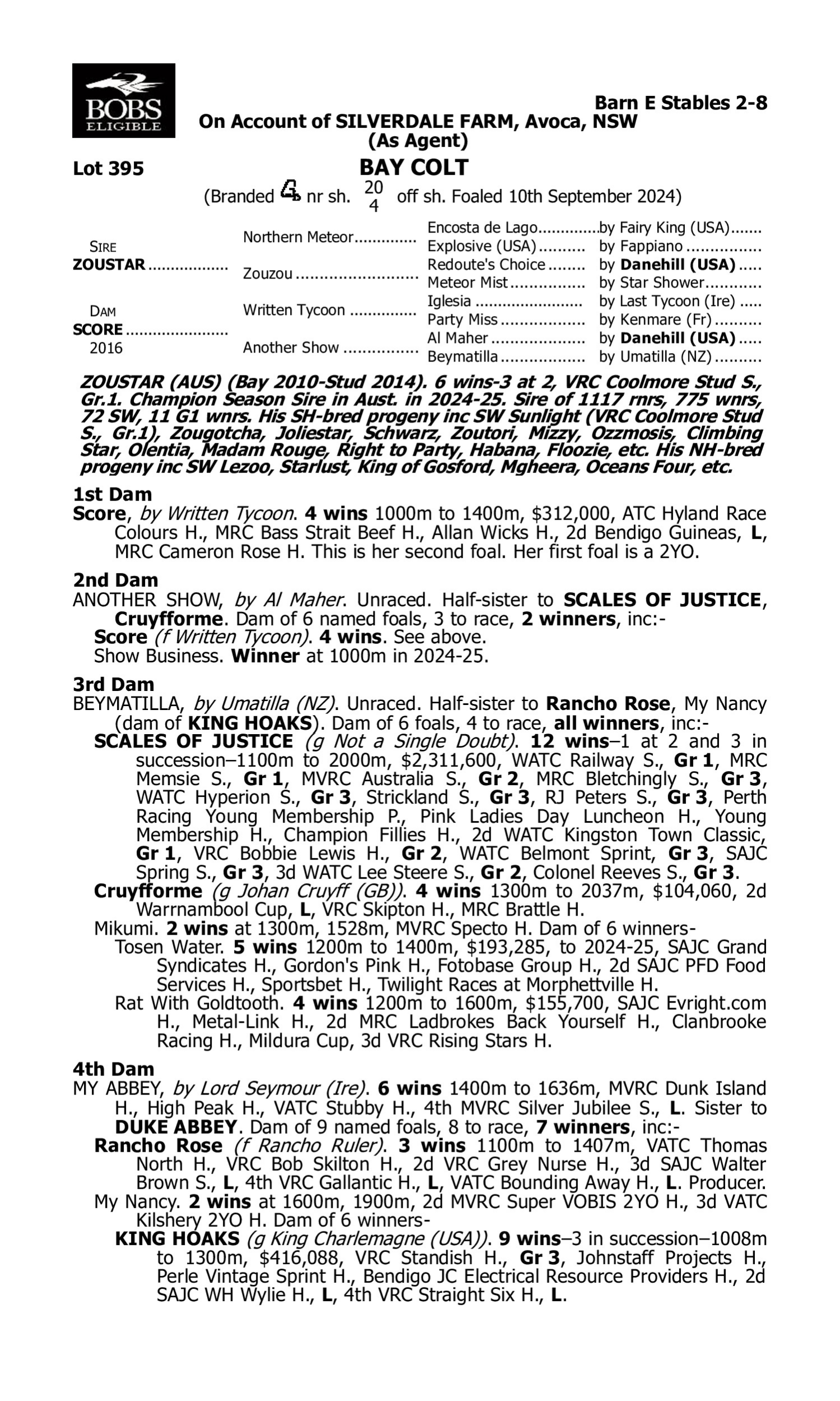 1st Dam Bolt By (2017.g. by Night of Thunder-Scarlet Moretta, by Fastnet Rock-Venetian Lady). 2025-11-23 1st Clare RC Clare Valley Cup 2nd Dam Lucky Generations (2020.g. by Russian Revolution-Virani, by Bernardini-Venetian Lady). 2025-12-10 1st HKJC Morrison Hill H.
