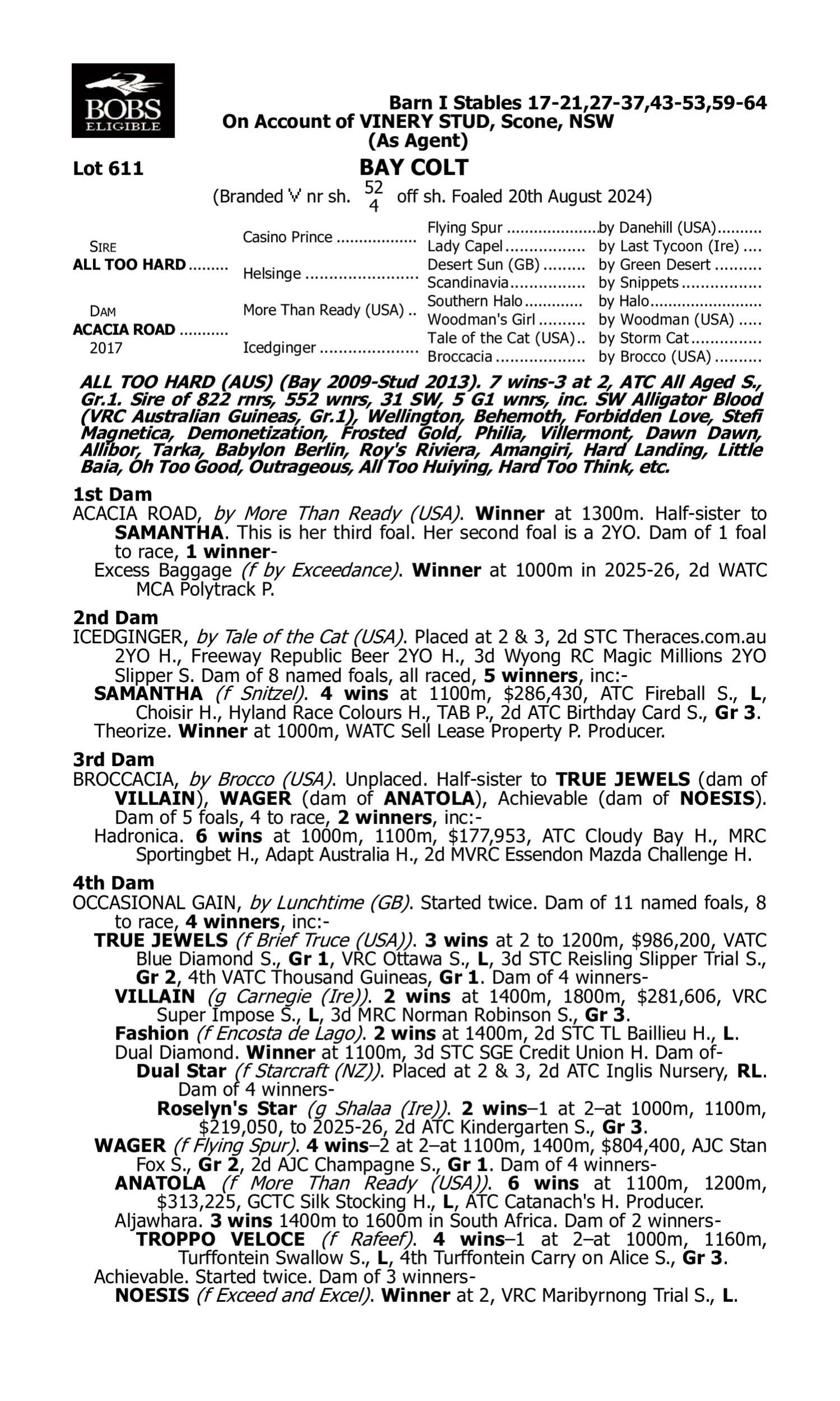 1st Dam Peace Baby (2021.g. by Exceedance-Absolemm, by Pierro-Nothin But a Dream). 2025-12-20 2nd Alice Springs TC AN Electrical H. 3rd Dam REGAL ZEUS (2020.g. by Zoustar-Quiet Kitten, by Kitten's Joy-Quiet Alice). 2025-12-26 1st MRC (Sandown) Lord S. L 2025-11-23 1st Kilmore Cup L