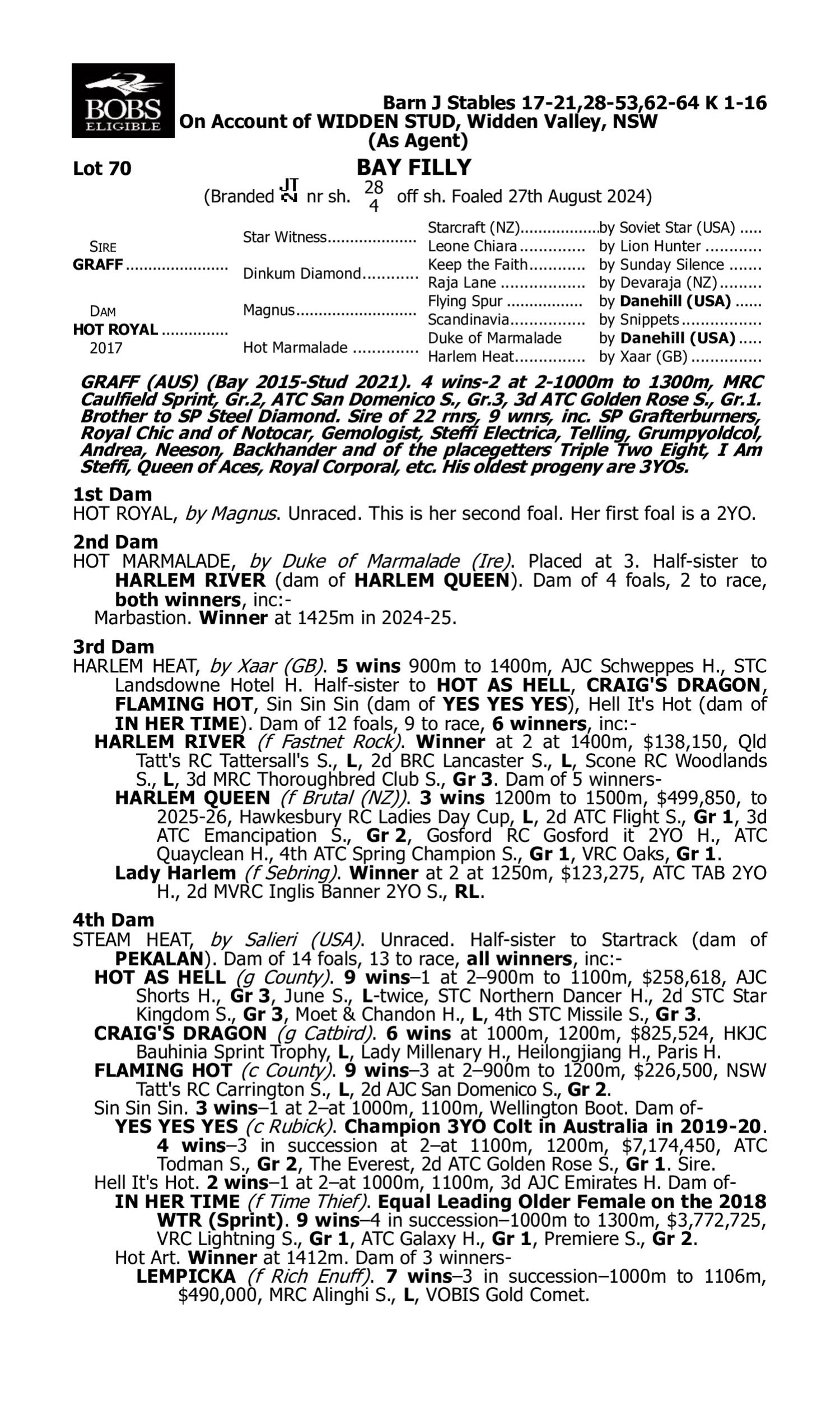 1st Dam ZIP LOCK (2023.c. by Hellbent-Honolulu Lass, by Hinchinbrook-Velasco). 2025-12-27 1st BRC (Eagle Farm) BJ McLachlan S. Gr.3 2025-11-15 1st BRC (Doomben) Road to Magic Millions 2YO H. 2nd Dam Just Cruisin' (2020.g. by Street Boss-Reve de Victoire, by Anabaa-Velasco). 2025-12-10 2nd TTC Conquering S. L 2025-11-21 2nd TTC Newmarket H. L 2025-12-28 2nd The Inevitable S. L Chayse 'n' Artie (2019.g. by Flying Artie-Reve de Victoire, by Anabaa-Velasco). 2025-11-15 1st GCTC (Gold Coast) Phlat Crete H.